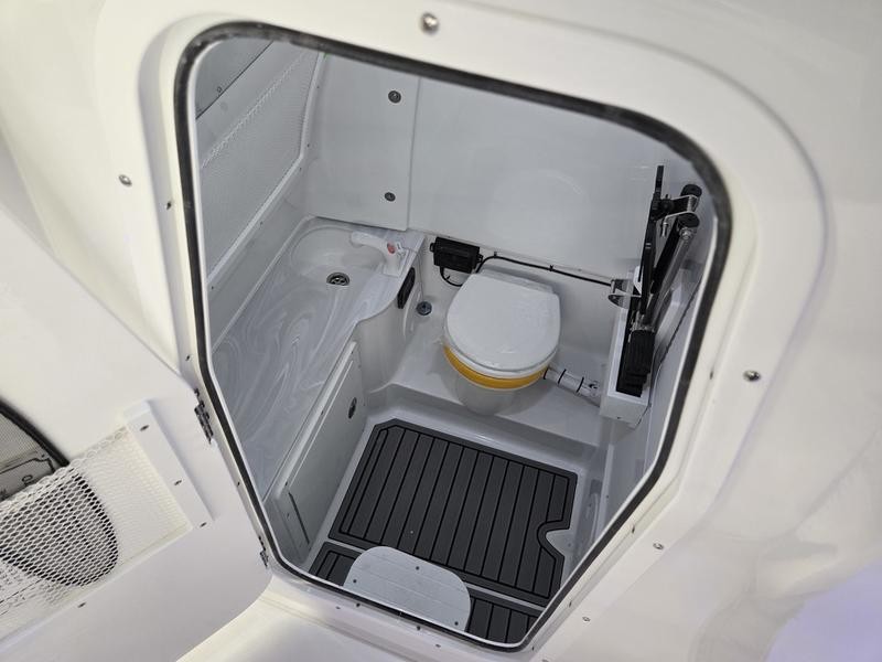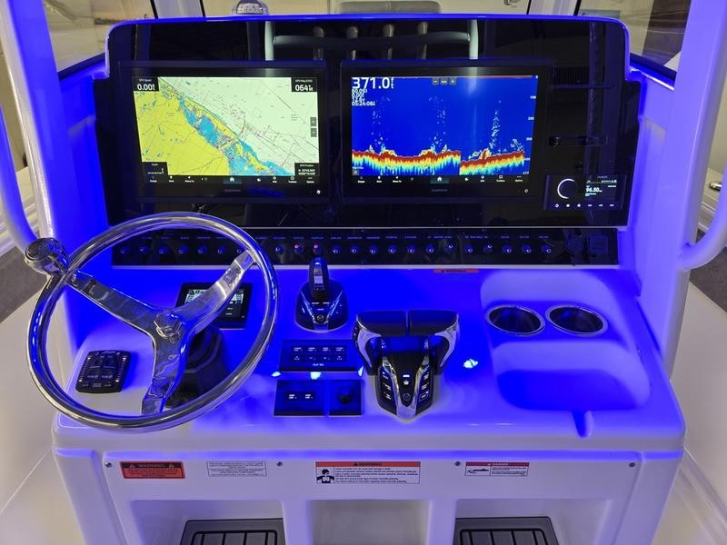 Helm: Black acrylic dash with phone holder/wireless charger, Yamaha electric steering, and a tilt helm