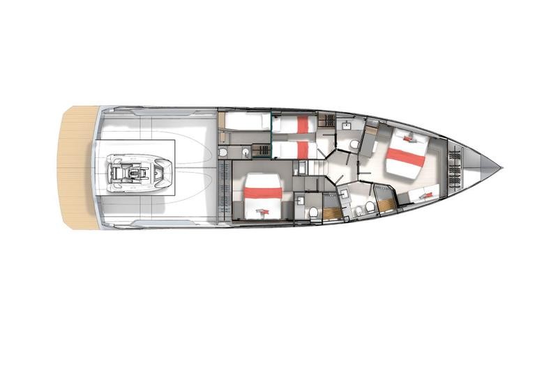 The standard version features a main deck galley facing the lounge area, freeing up room on the deck below for two comfortable ensuite guest cabins (1 twin and 1 double); while the exceptionally spacious owner’s cabin, located forward, showcases a transversally arranged double bed. There is also a port-side crew cabin with independent access forward of the engine room, providing enhanced functionality.