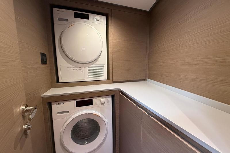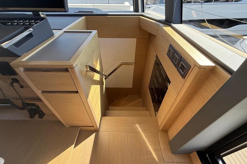 At the stern, the hydraulic swim platform extends the outdoor living space, effortlessly converting the aft deck into a serene waterfront lounge. Whether relaxing at anchor, taking a swim, or launching a tender, this thoughtful design brings comfort right to the water’s edge. To port and starboard, hydraulic side terraces fold down to dramatically increase the beam, transforming the cockpit into a spacious social zone that enhances both entertaining and movement around the deck. Forward, the expansive bow area invites relaxation with a large sunpad, adjustable seating, and a dining space—perfect for enjoying the views underway or at anchor.