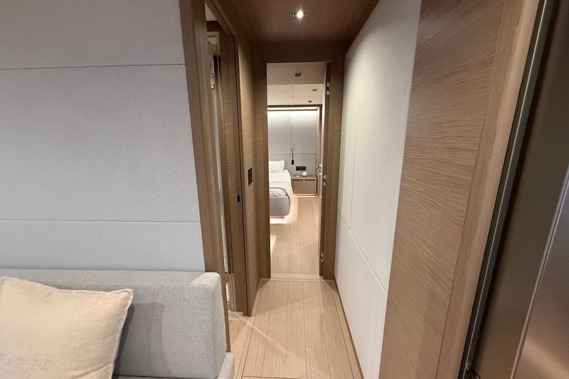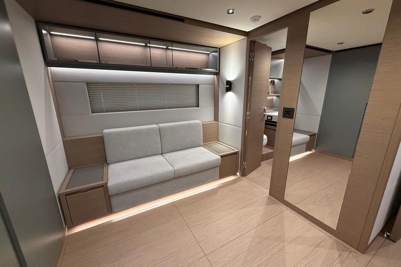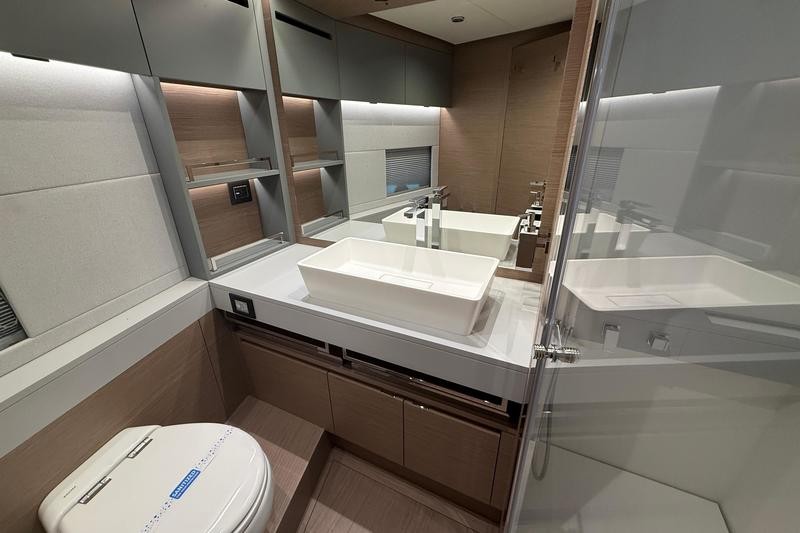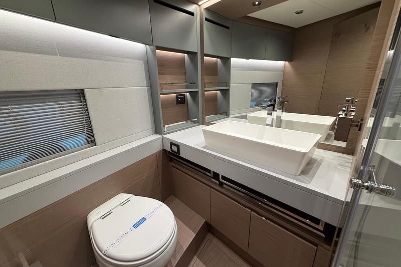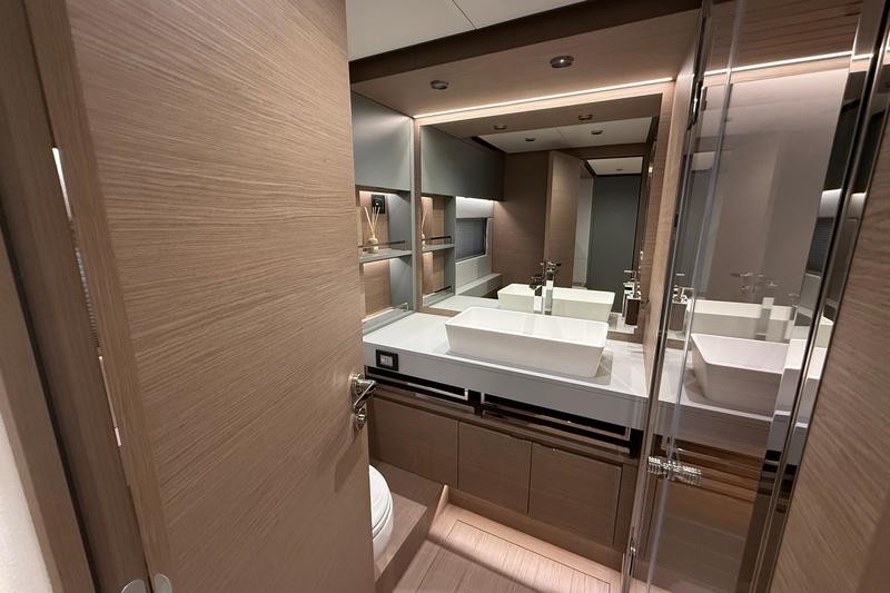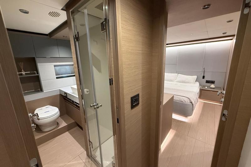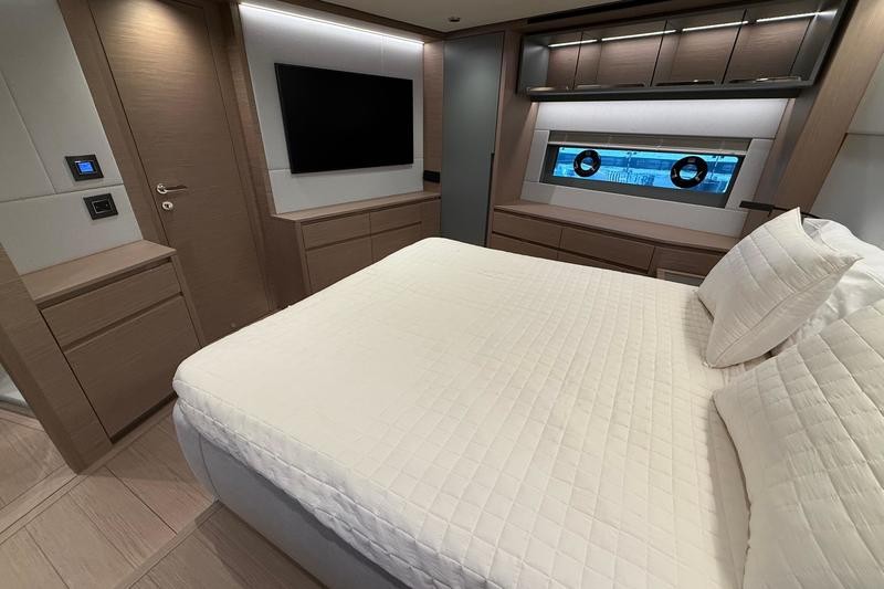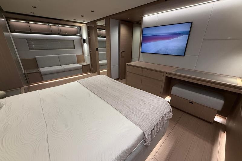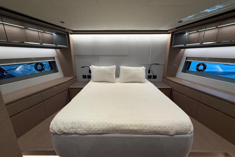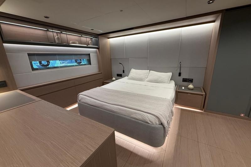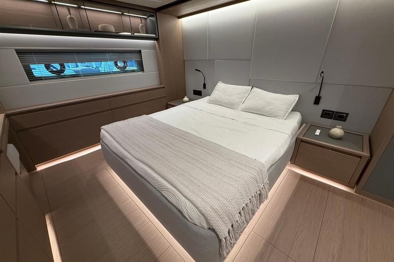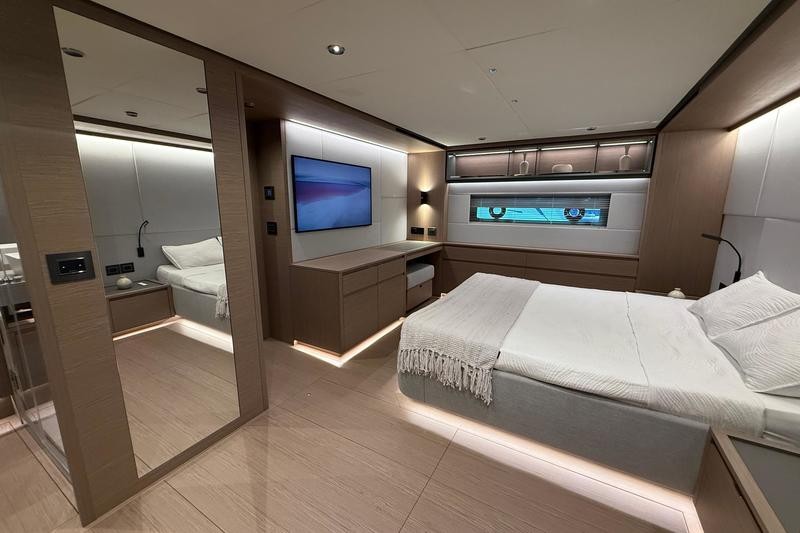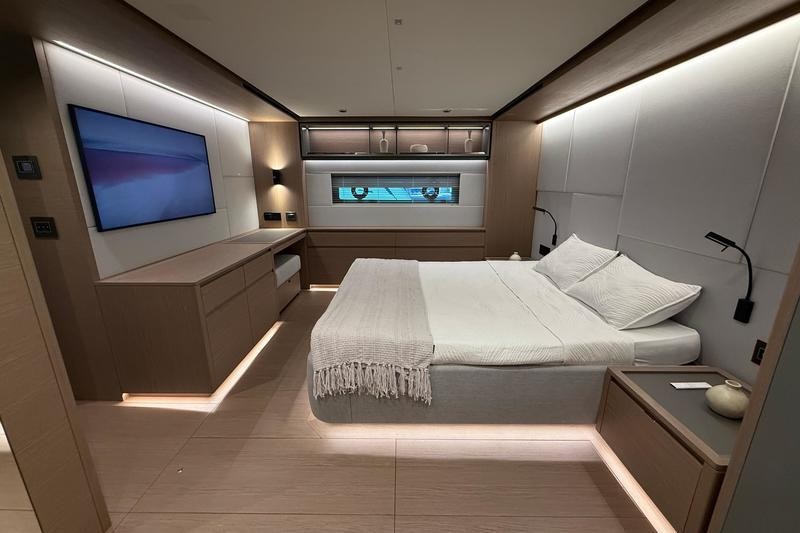When it’s time to step out of the sun, fully opening aft doors create a seamless connection between the outdoor lounge and the salon, forming one bright, inviting space. Inside, the GT75 feels like a modern seaside villa—open, airy, and elegantly detailed. Owners can choose from two main deck and five lower deck configurations, allowing for complete customization to suit any lifestyle. Whether the galley is positioned up or down, the salon is flooded with natural light from panoramic windows, while high-end materials and meticulous craftsmanship elevate every surface. Below deck, up to four luxurious staterooms provide privacy and comfort, each with ensuite accommodations and ample storage. The full-beam master suite is a true highlight, featuring sweeping hull windows, a private sitting area, and a spa-inspired ensuite that redefines comfort at sea.