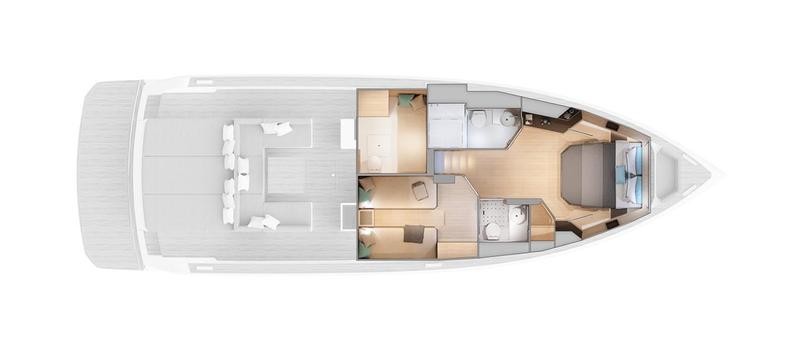 STRONG CHARACTERISTICS OF THE INTERIORS ARE THE OPTIMUM HEIGHTS, THE LARGE OPEN SPACE WITH TWO CABINS AND TWO BATHROOMS, THE POSSIBILITY TO ALSO HAVE A CABIN FOR THE SAILOR. THE LINEARITY AND REFINEMENT OF THE FURNISHINGS ARE ENHANCED BY THE CAREFUL CHOICE OF WOODS AND THE ATTENTION TO DETAIL THAT MAKE THE INTERIORS OF THE PARDO 50 AN EXCELLENCE OF MADE IN ITALY.