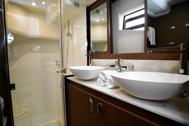 The owner's suite features a remarkable interior volume, with 2 meters of headroom, bathed in natural light. Located forward for greater privacy and sound insulation, far from the engine room and the dock, this true suite comes with a private bathroom and separate shower, a large king-sized berth, and generous hanging lockers.