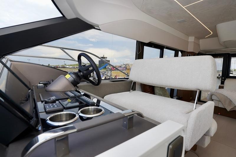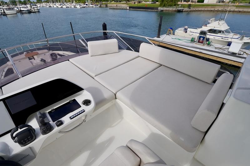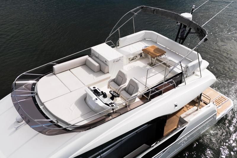 Sheltered by a hard top, the flybridge offers a true terrace overlooking the ocean: the ideal spot to savor precious moments together while taking in the panoramic view. Just next to the helm station and its two comfortable armchairs, generous sundecks invite relaxation. The spacious exterior saloon and dining table are perfect for special moments with friends, with the sea extending across the horizon.