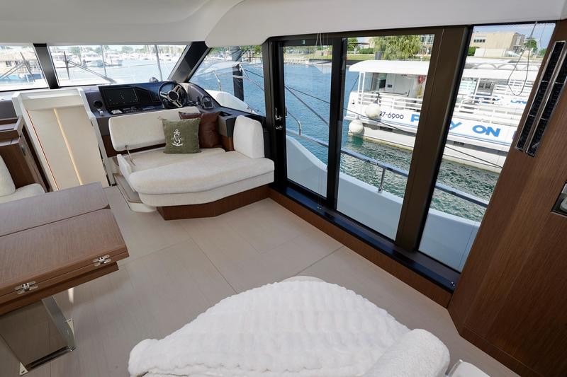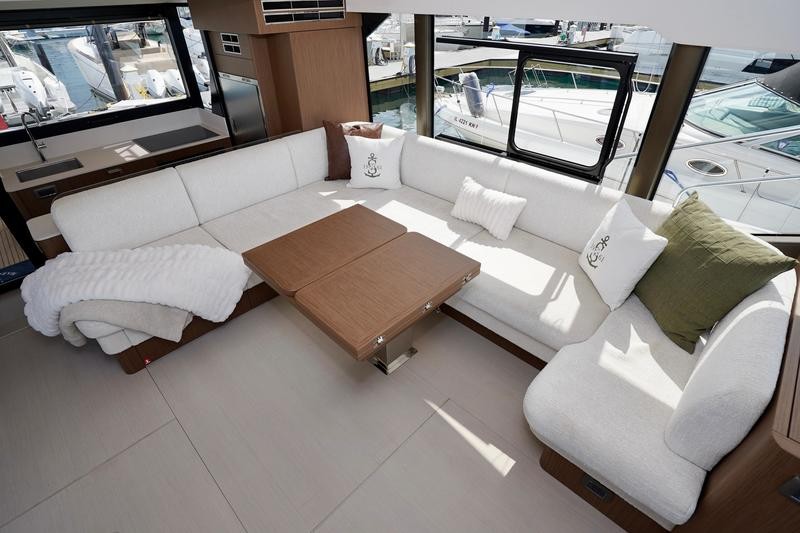 Peacefully settled into the curve of a sumptuous C-shaped sofa, facing an immense sliding glass door, you sense a connection to the sea, omnipresent in the interior saloon, wherever you turn your gaze. The atmosphere is warm and soothing. The design, superior fit and finish, and lighting contribute to the magic of your evenings at anchor, facing dream landscapes.