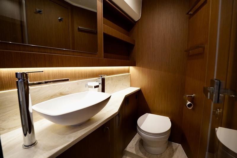 The owner's suite, cleverly situated forward in a semi-main deck arrangement, provides a quiet, peaceful, intimate living space for the owner, conducive to reflection, or simply rest.