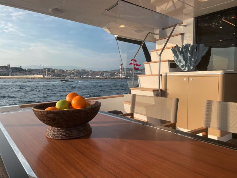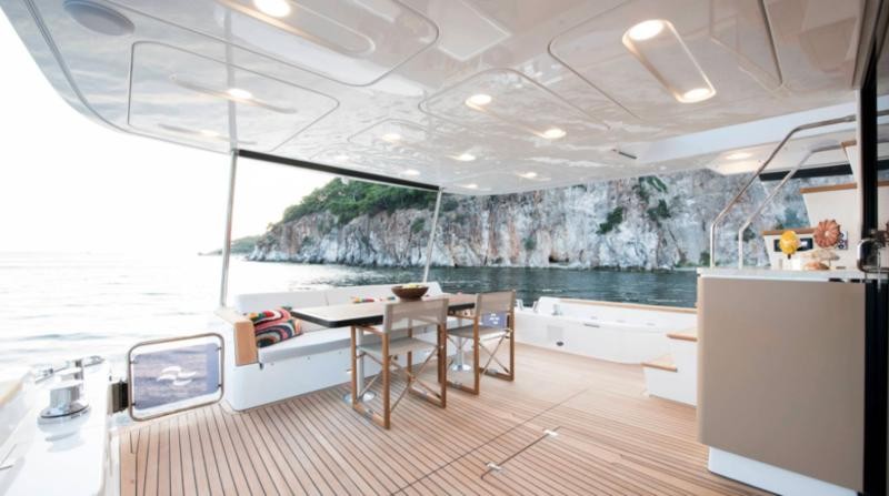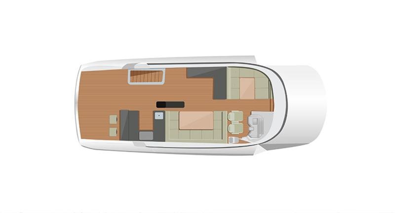 Forward of the galley is a large U-shaped settee where family and friends can congregate while sharing their time aboard with the helmsman too. Outside the saloon, the side decks have large cutaway sections of the bulwarks, improving the lines of sight for those inside.