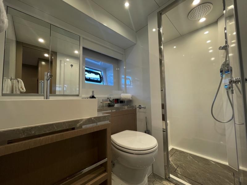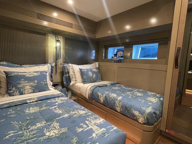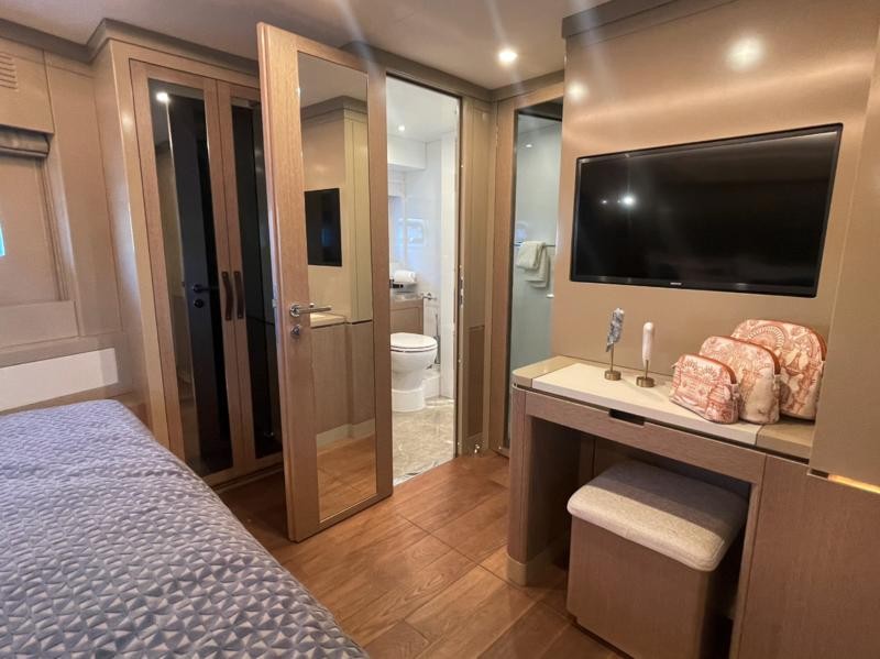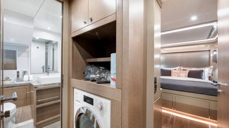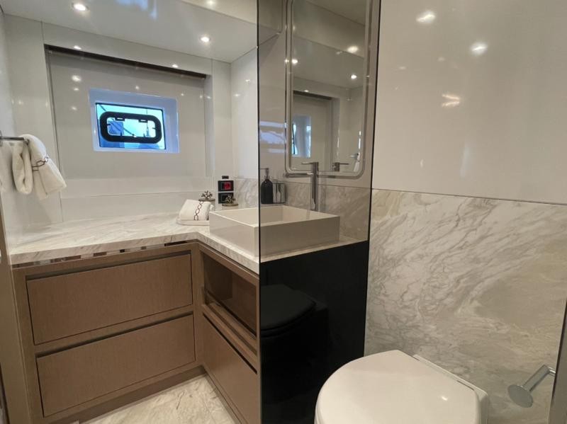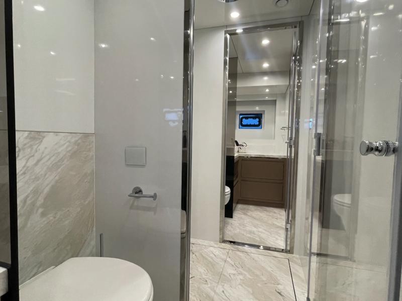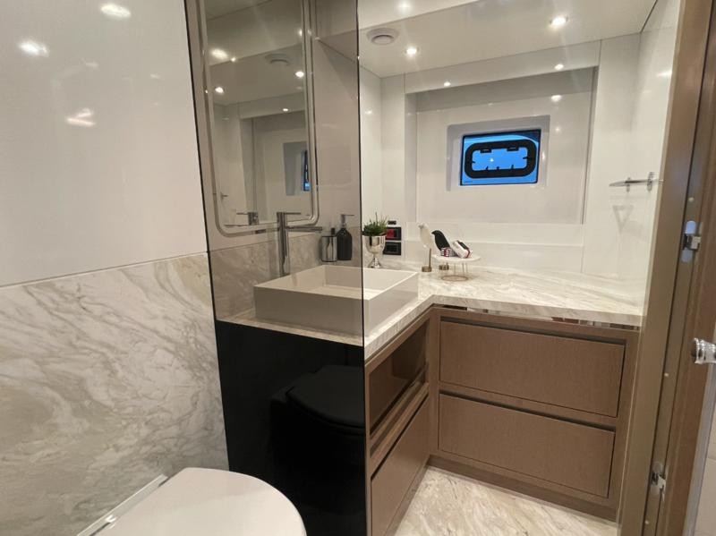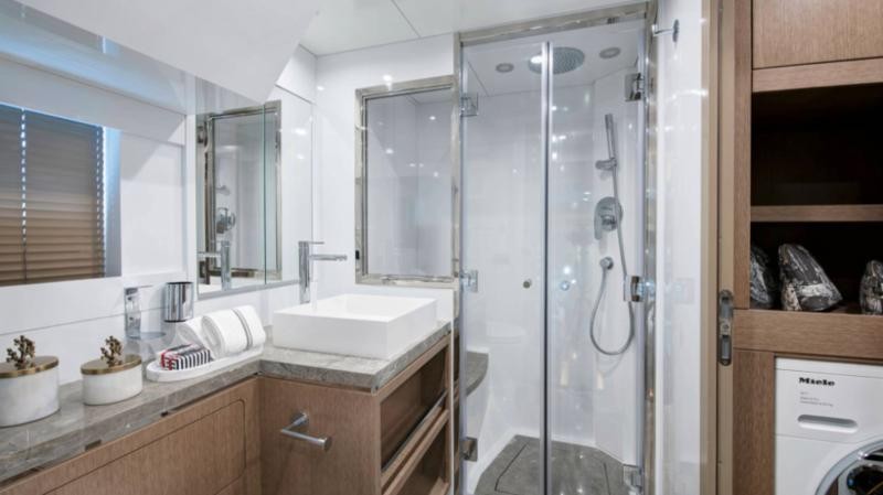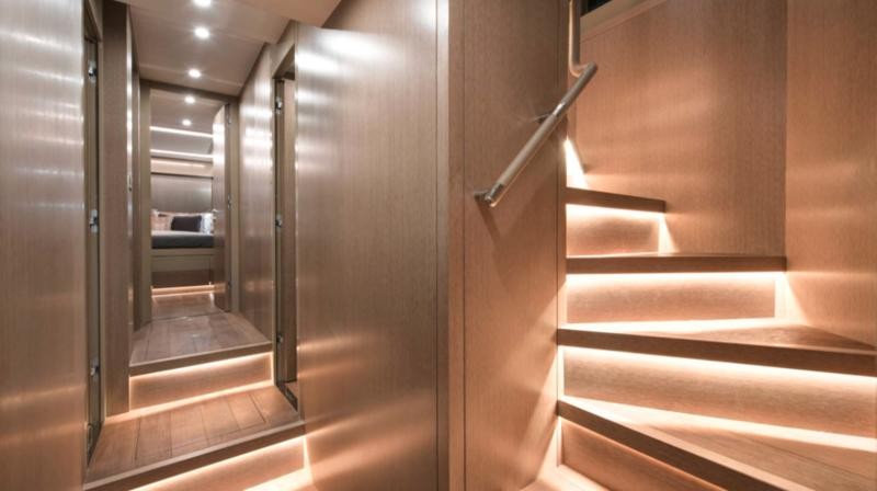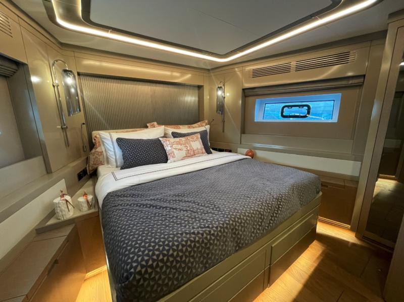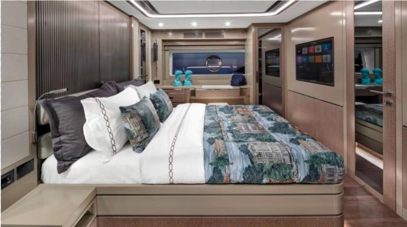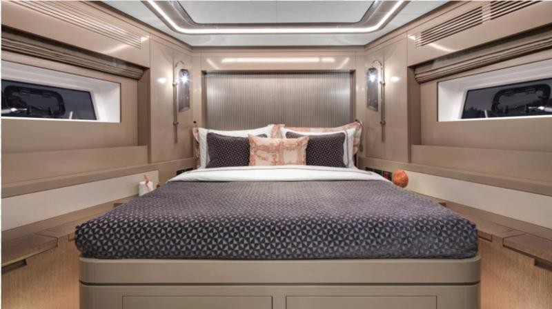 Belowdecks the amidships master stretches across the full beam, where a king-size berth welcomes the owner, and seems to float thanks to inventive lighting design. Large hullside windows admit natural light and provide views of the water's surface. This stateroom is served by a his-and-hers head arrangement, affording a high level of luxury, similar to designs popularized by numerous megayachts.