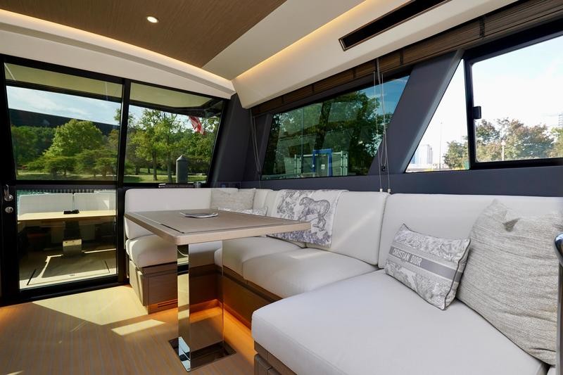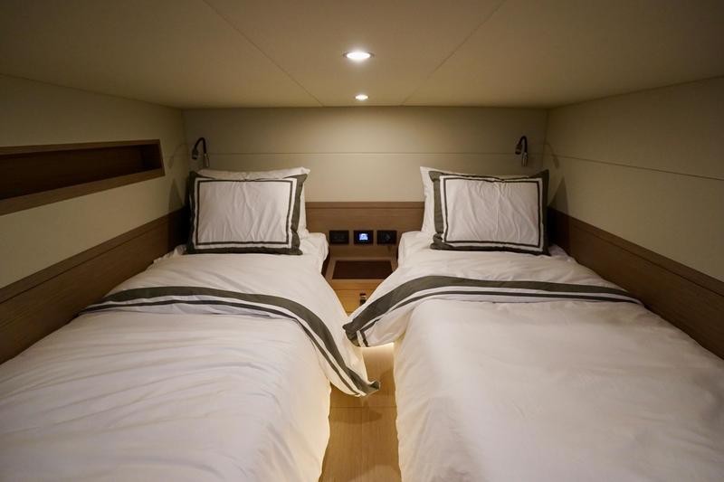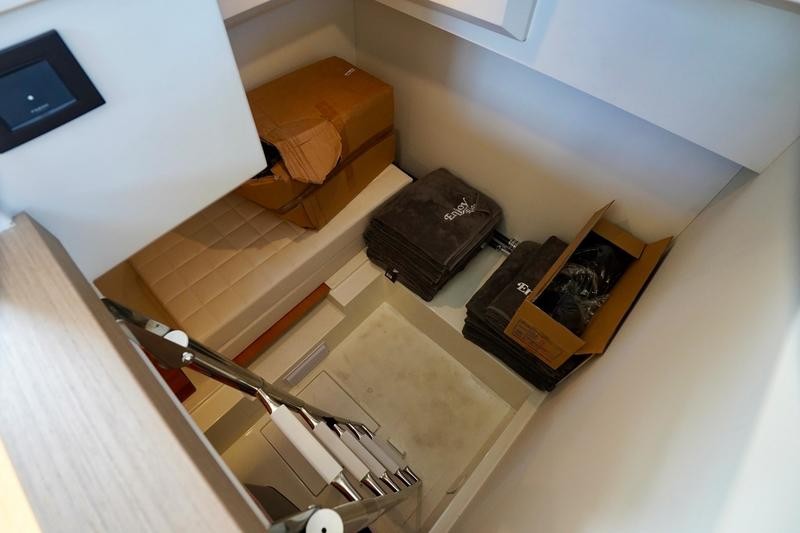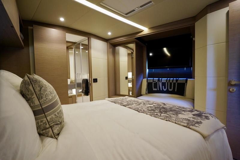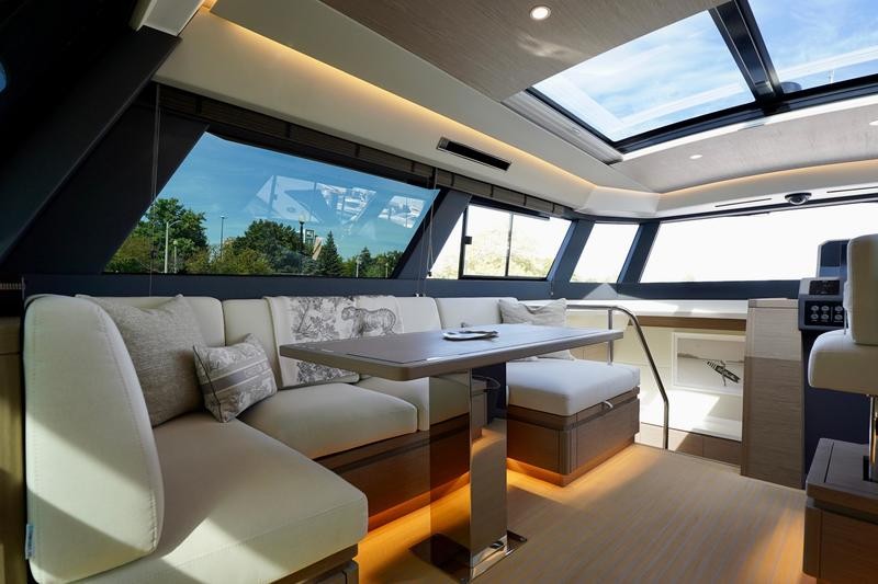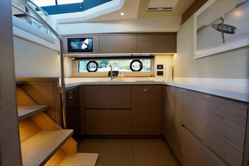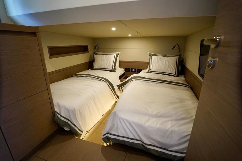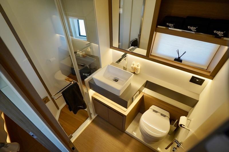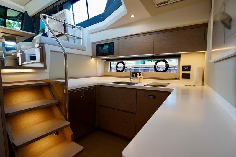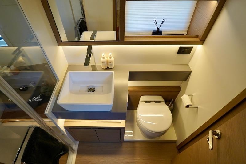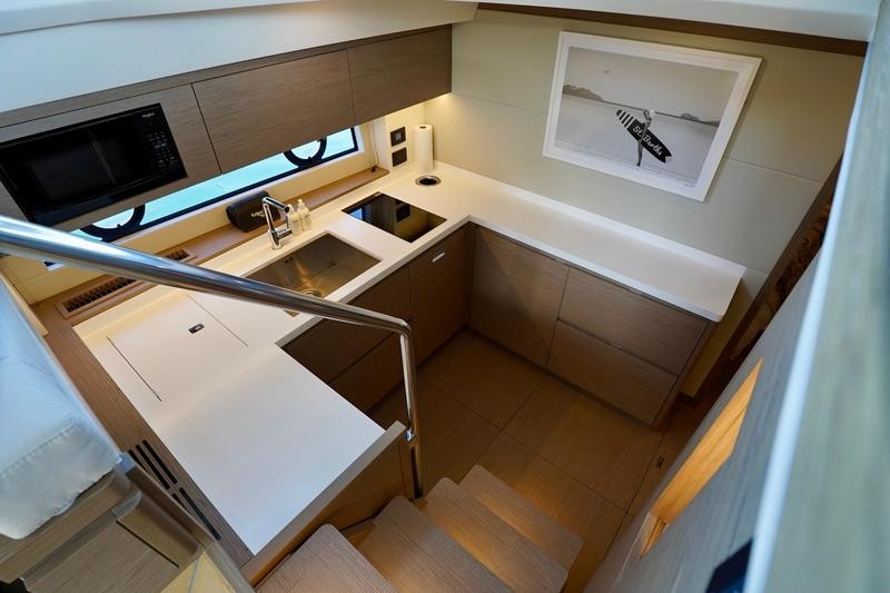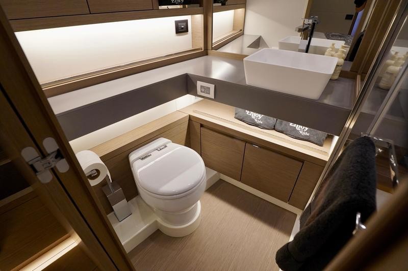 The architecture of the spaces allows two layout options: galley up and galley down. With the first one, it is possible to have a lounge area with TV or a third cabin with a bunk bed on the lower deck level, with the second one, the square of the dinette is even bigger and the kitchen below deck is even more equipped for use even in colder weather conditions.