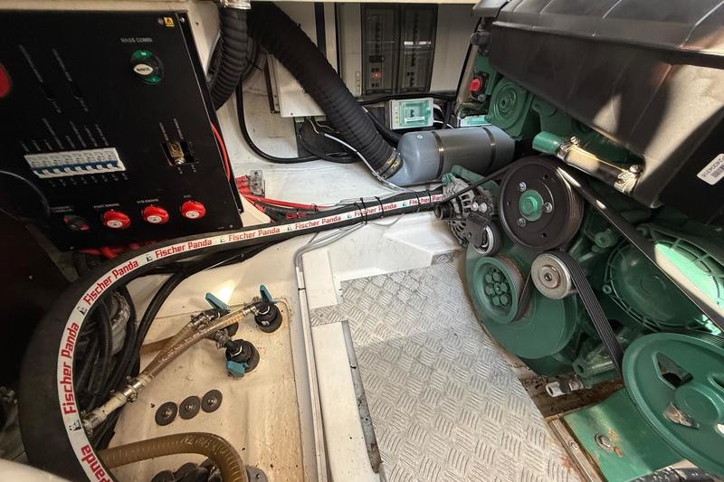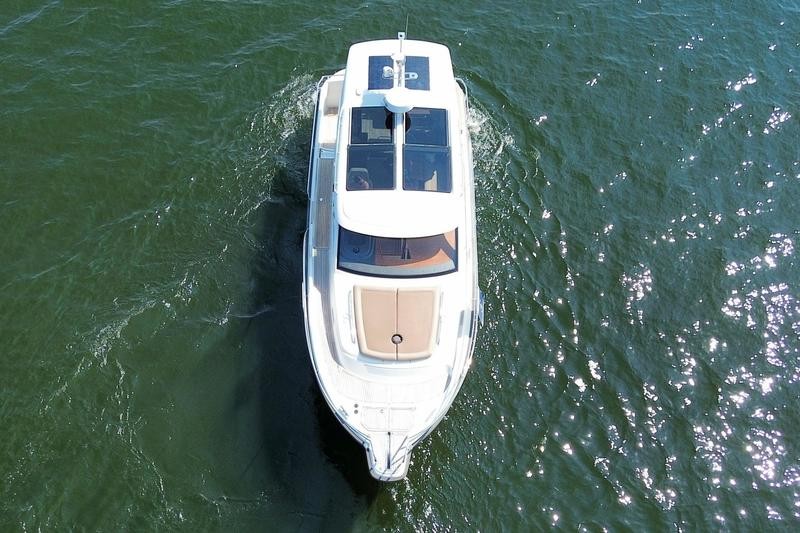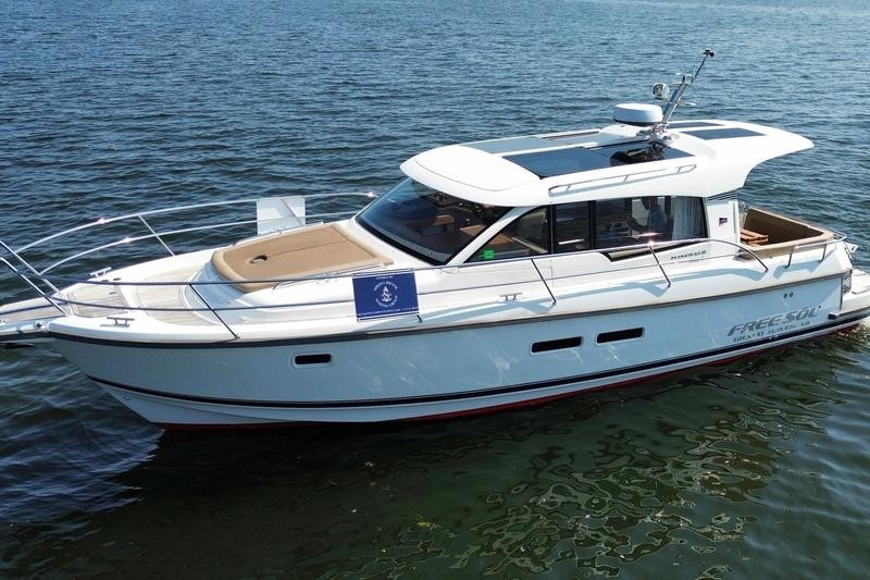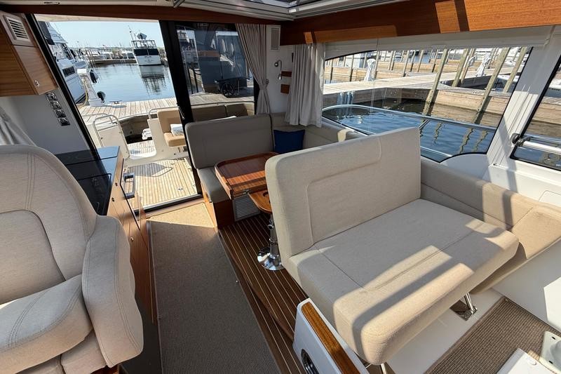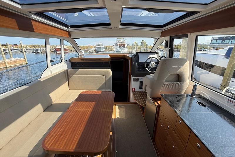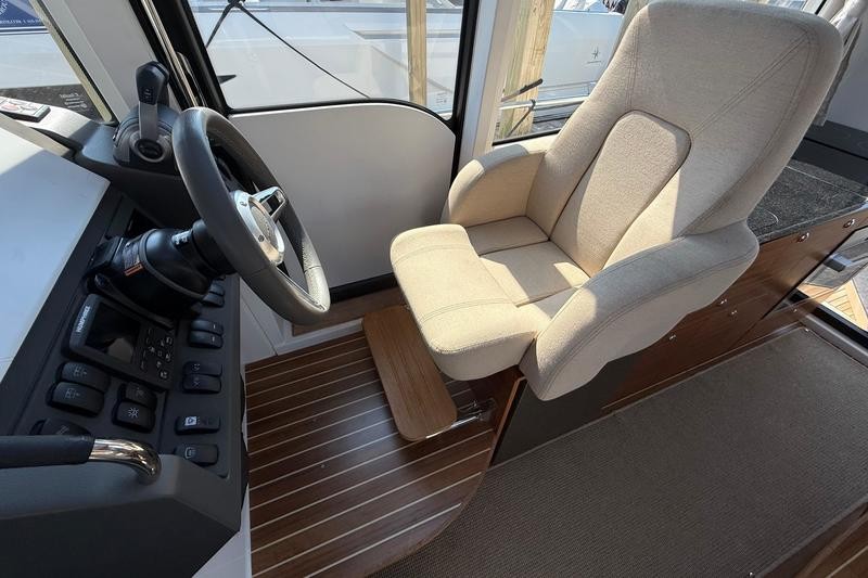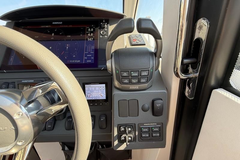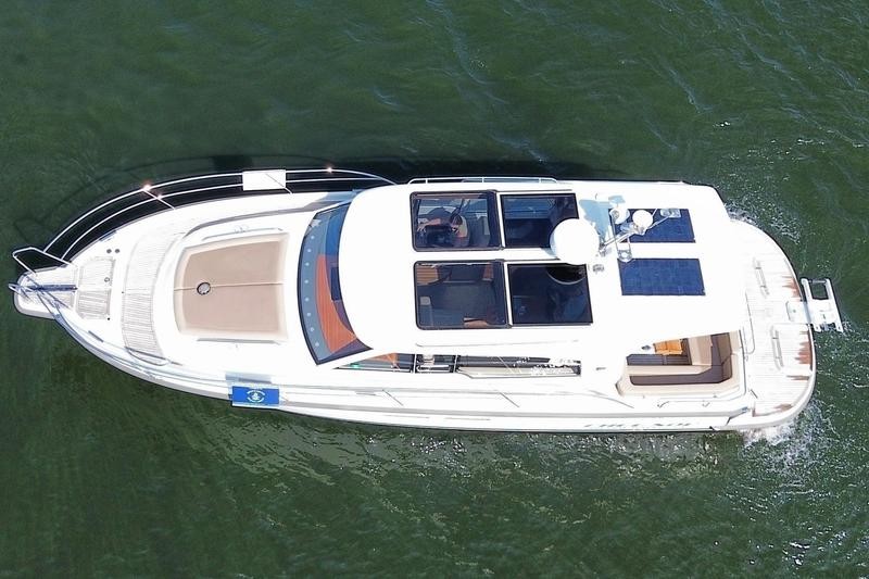 Comfort is prioritized with a diesel heater/defroster, hot water system, electric toilet with pump-out, LED lighting, and electric roof hatches. Bow and stern thrusters with remote control, trim tabs, a bow ladder, and a full mooring package make handling smooth and simple. Added features like a sunshade canopy set, solar energy system, diesel generator, air conditioning in multiple zones, and advanced Humphree Interceptors ensure every journey is as relaxing as it is refined.