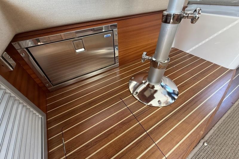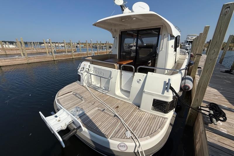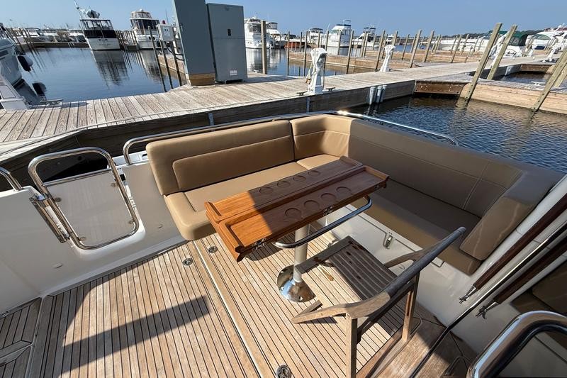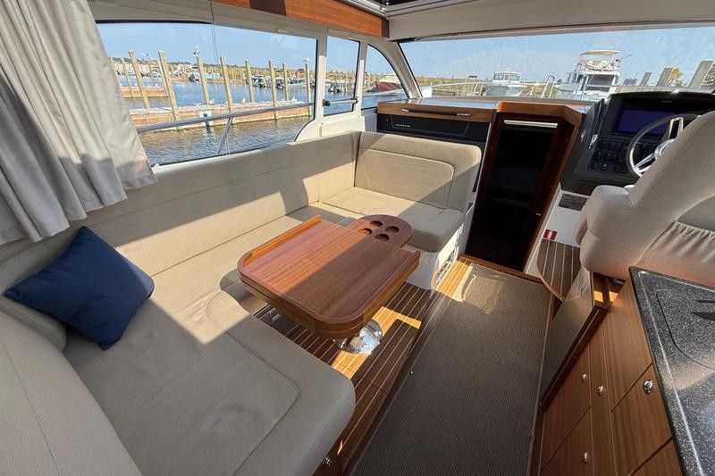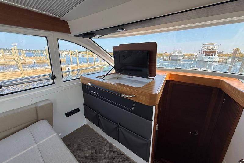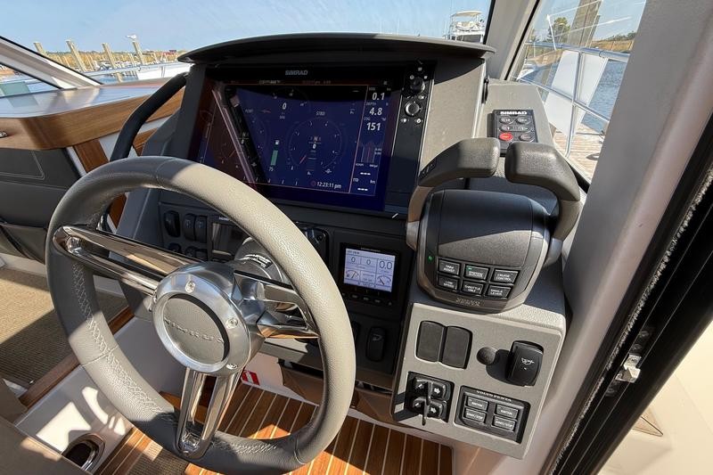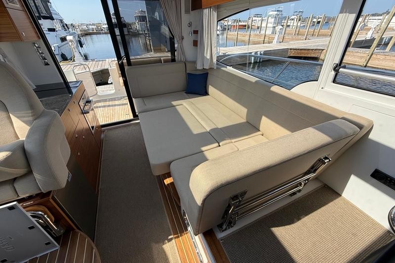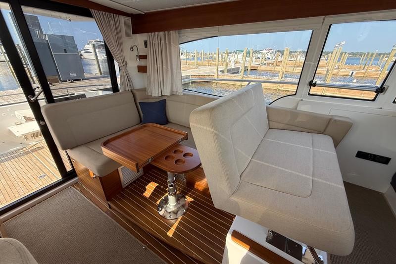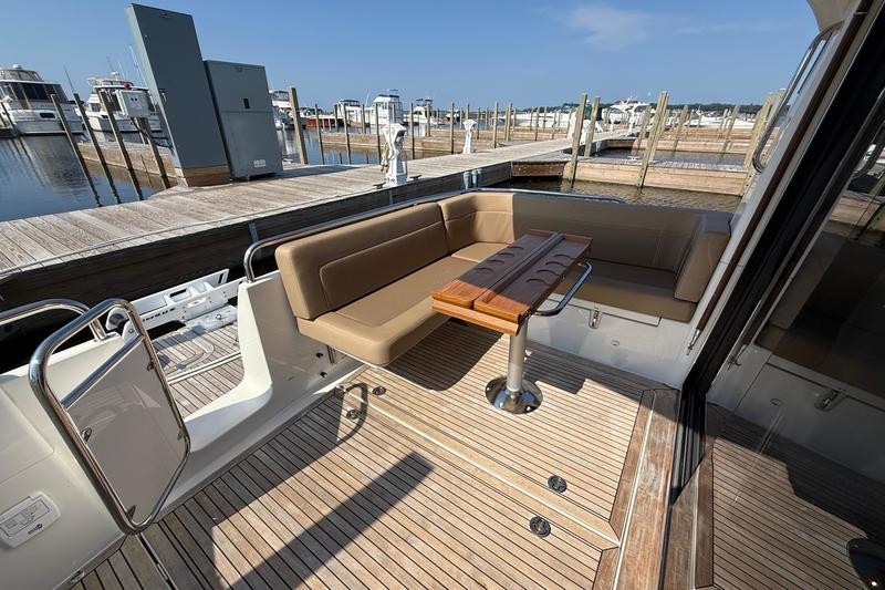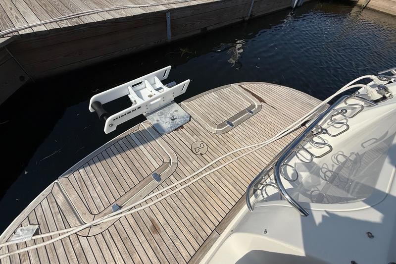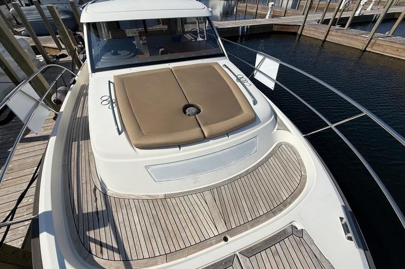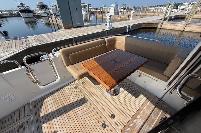 Inside, this boat features plush Sunbrella Natte beige interior cushions, a stylish teak finish throughout, and a thoughtfully designed galley with a freezer, additional refrigerator, microwave, coffee machine prep, and a kitchen fan. The deck salon is designed for entertaining, complete with a high-performance audio system, multiple TVs, and upgraded Simrad navigation electronics, including radar, autopilot, VHF with AIS, and a 16" EVO 3 chartplotter.
