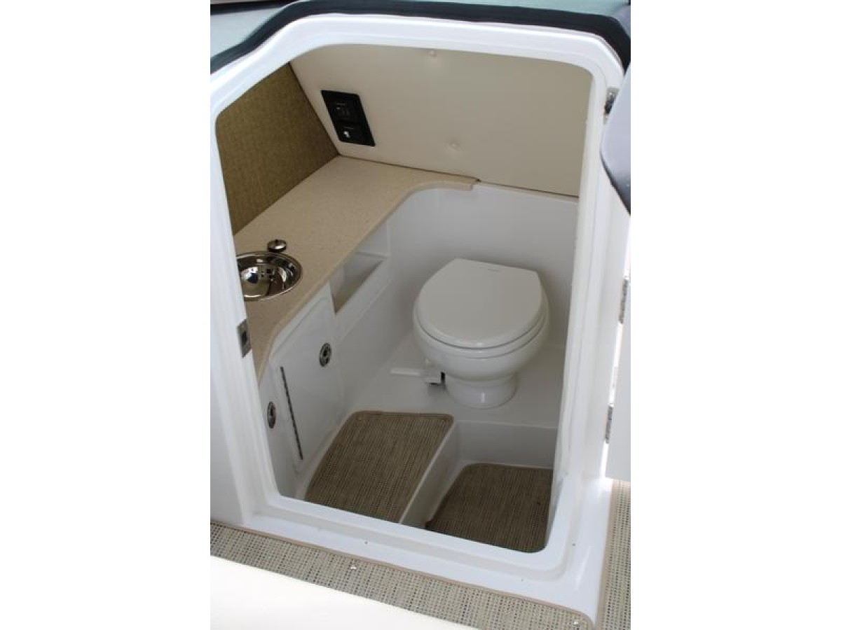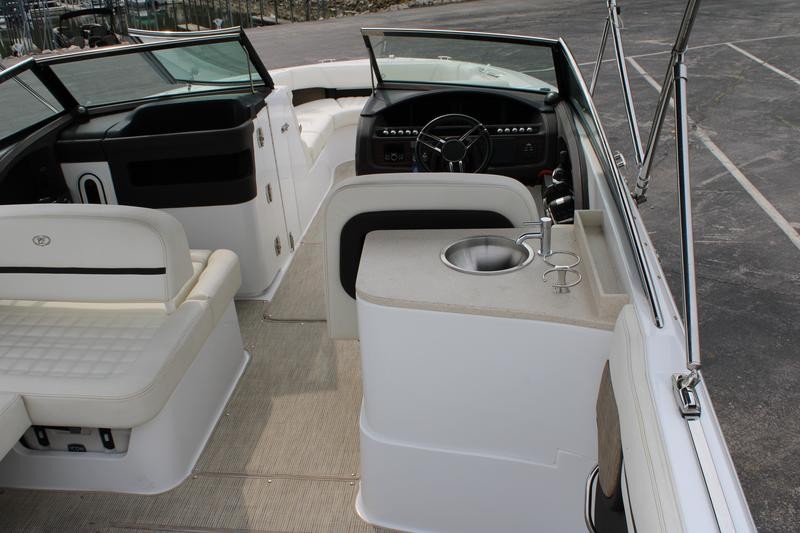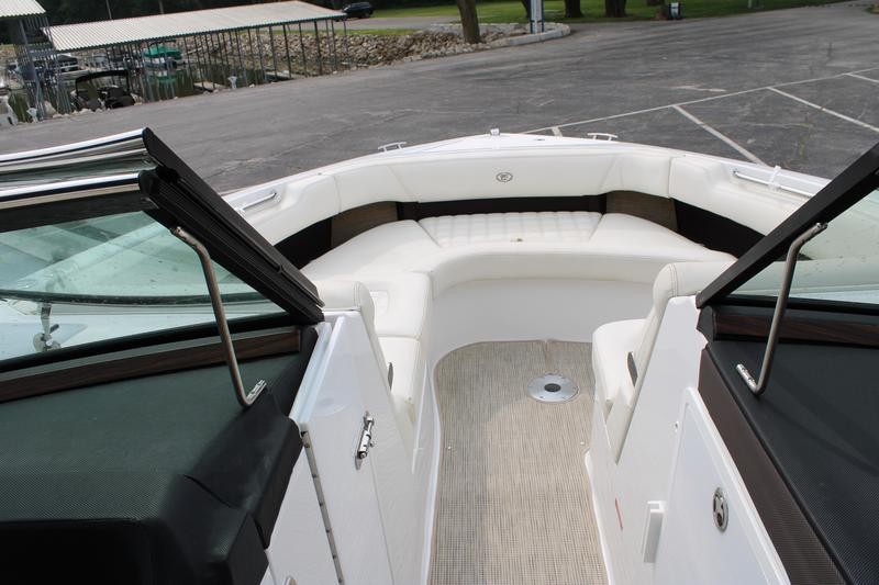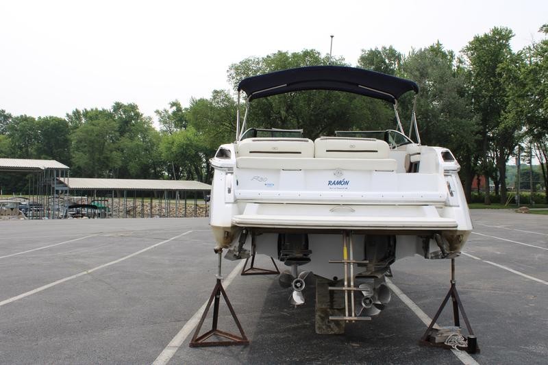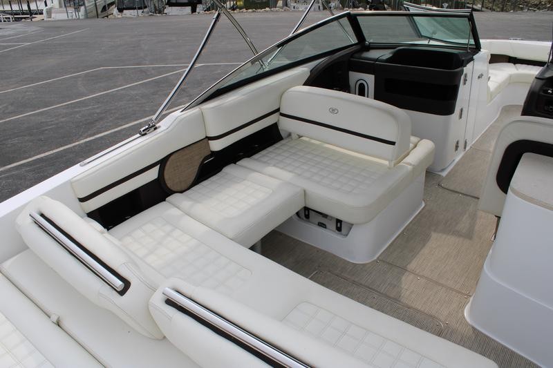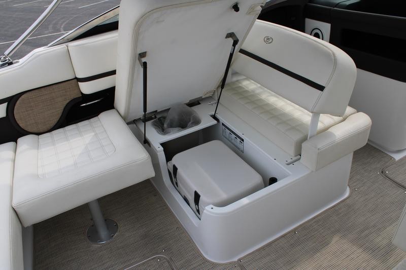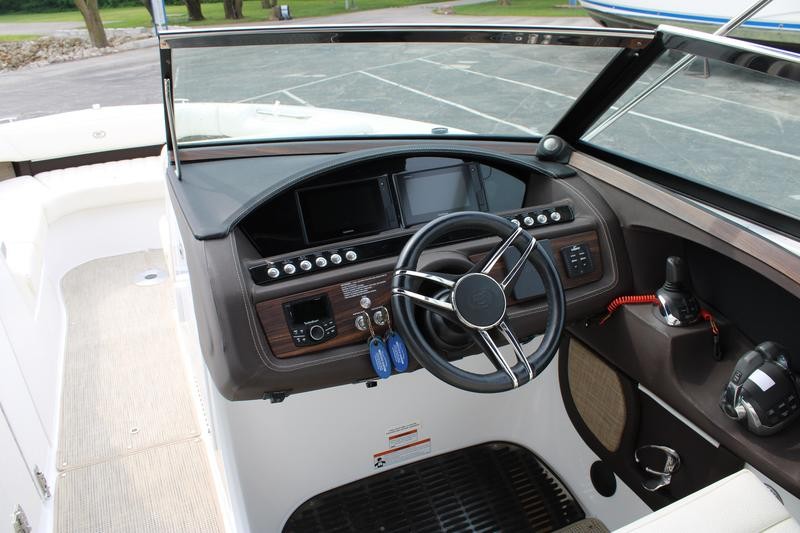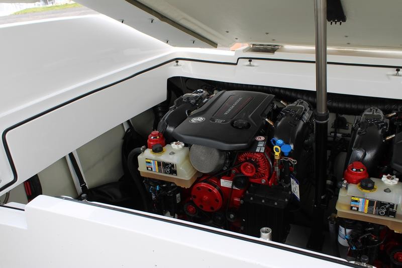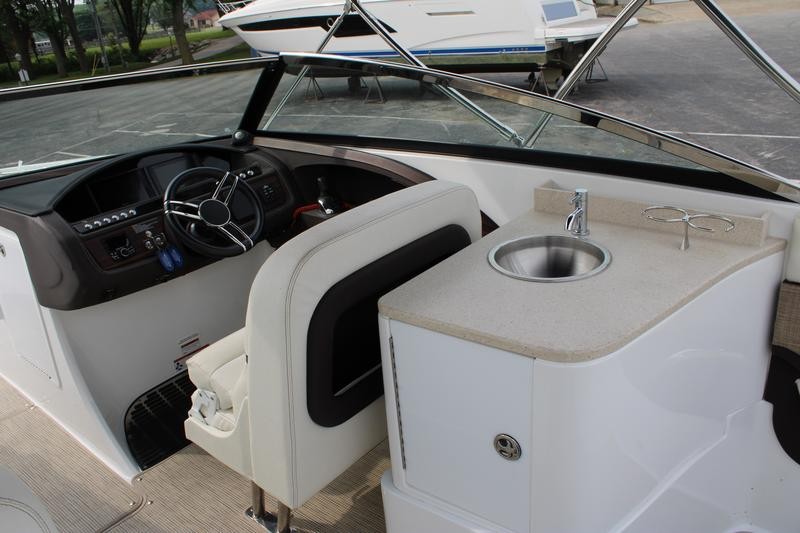 The R30 features a hydraulic swim platform that lowers into the water for easy access, is available with single or twin engines, and boasts custom craftsmanship that beckons passengers to step aboard to experience its luxury for themselves. he wide engine hatch opening allows for easy access, easy maintenance, and storage space access—and the easy-lift hatch is gasket sealed when closed to reduce noise in the cockpit. Find a polished stainless steel top surface cap to windshield frames and enjoy the brightwork look the windshield possesses—all crafted to reflect heat in the sun and be cooler to the touch.