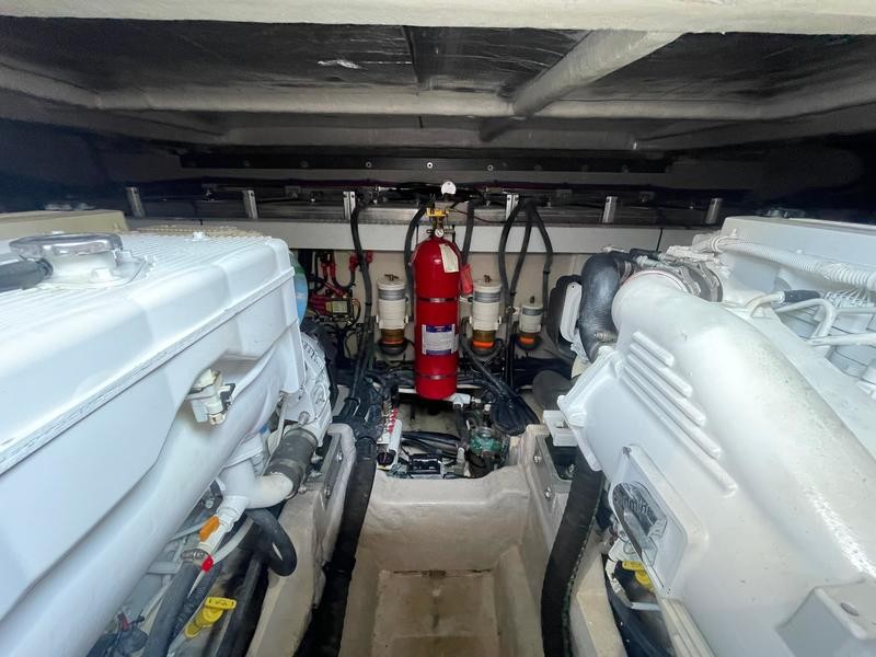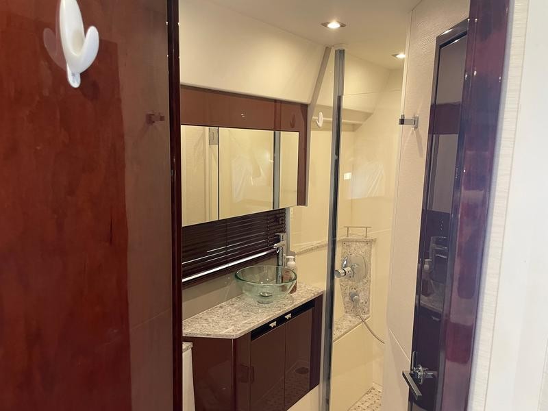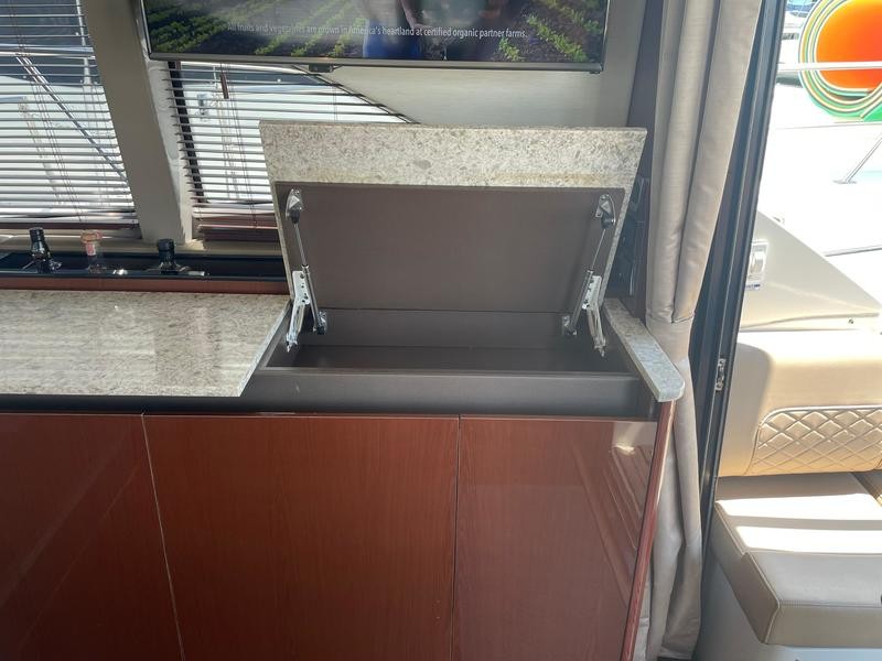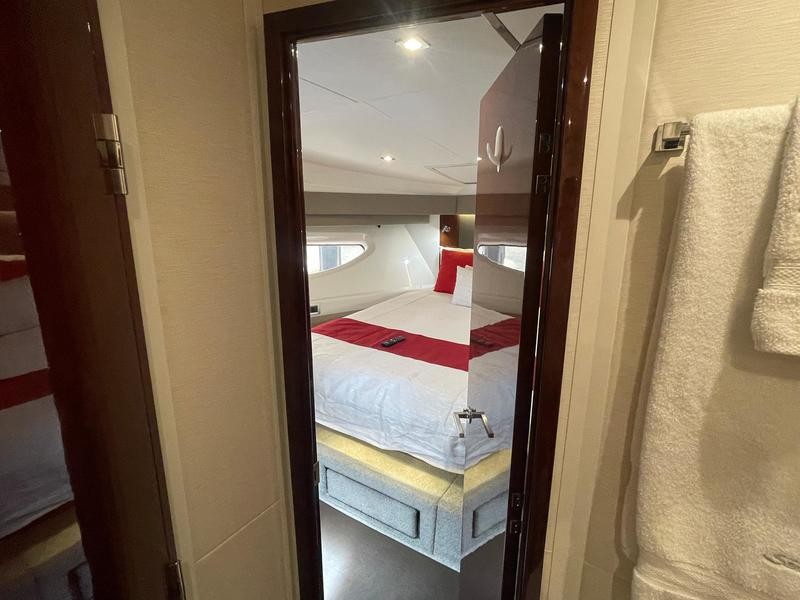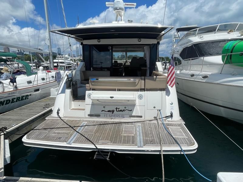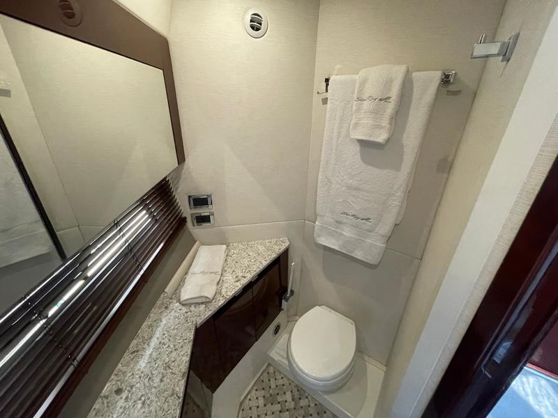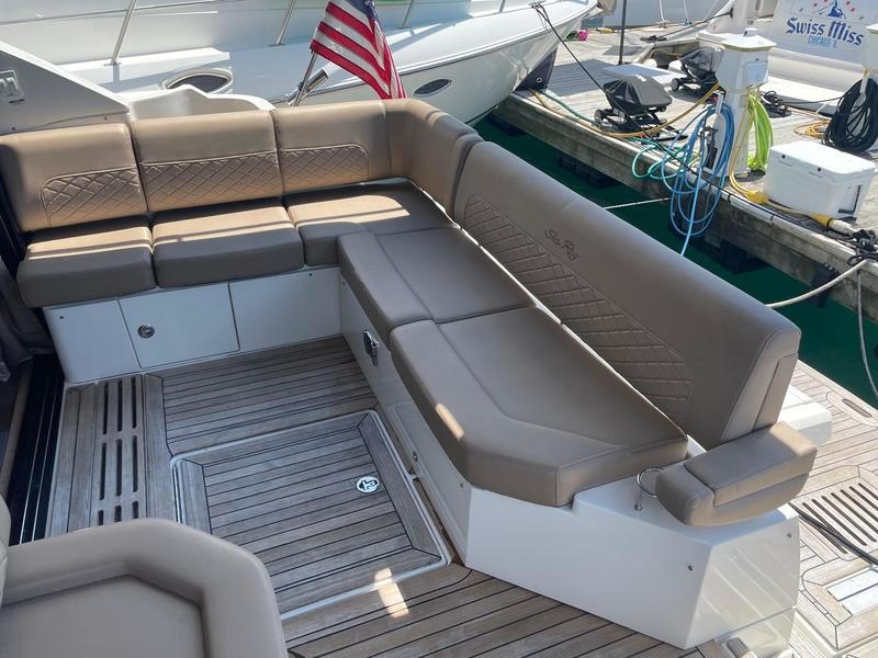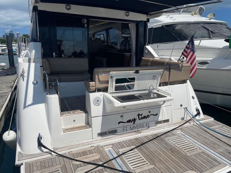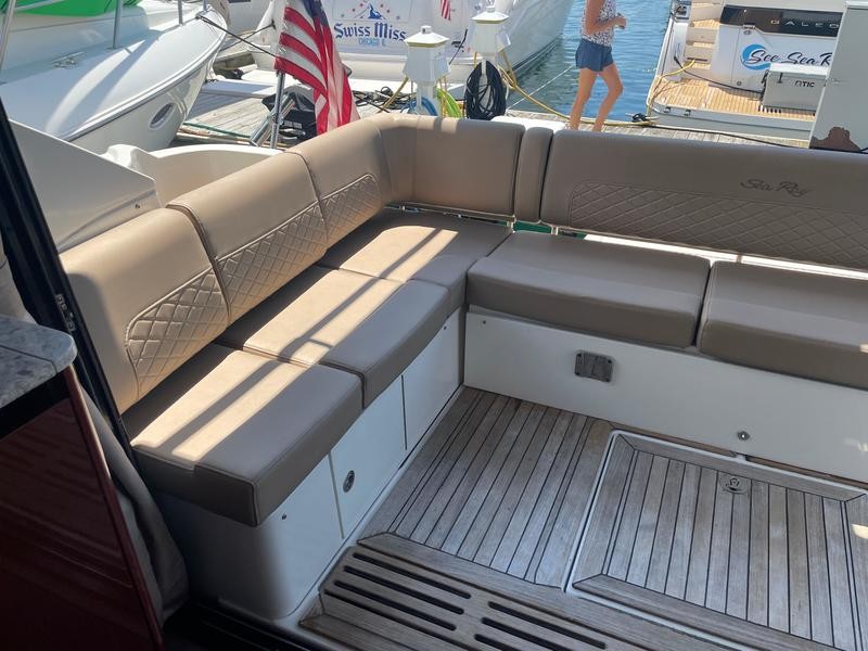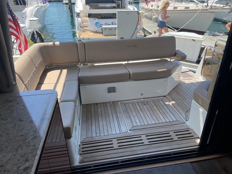 "My Time" is a true example of pride of ownership! This Sea Ray is now for sale by the second owners who have put 80% of the current hours on the engines (690). This Sea Ray is loaded with all the options one could want Twin 550 Hp Cummins Zeus pods feature a joystick docking system that has auto grated Sky Hook and autopilot. The Teak Hydraulic Swim platform includes both options to carry a tender or be the perfect teak beach with integrated steps. There is also a grill and sink located in the beach galley, the perfect spot to grill up some food while anchored in your favorite cove. As you step up into the cockpit there is ample seating with a moveable aft seat for even more leg room. The port side galley is spacious with plenty of storage for extended trips and all the expect amenities. The Salon is immersed in natural lighting by the large windows all around and a full sunroof. Seating to port and starboard offer enough space for all family and friends to find a comfy spot. The well laid out helm features twin Raymarine touch screens and easy to understand switches. As you head down into the staterooms you'll notice the atrium style entrance. Forward is the VIP stateroom with a full queen and the option to split the bed for twins. The day head features a full standing shower with a jacket and jill entrance between the VIP stateroom and hallway. To port you will find the wrap around entrance into a full beamer master stateroom with a full ensuite head. Twin hanging lockers fitted with cedar wood offer enough space for clothing with even more drawer storage. Tucked under the master tv you'll find a washer/dryer unit. The bow features large sun pad with a snap cover.
