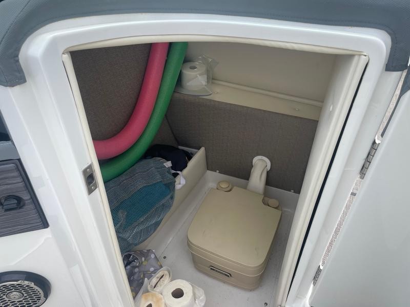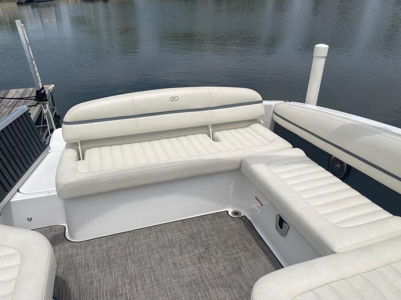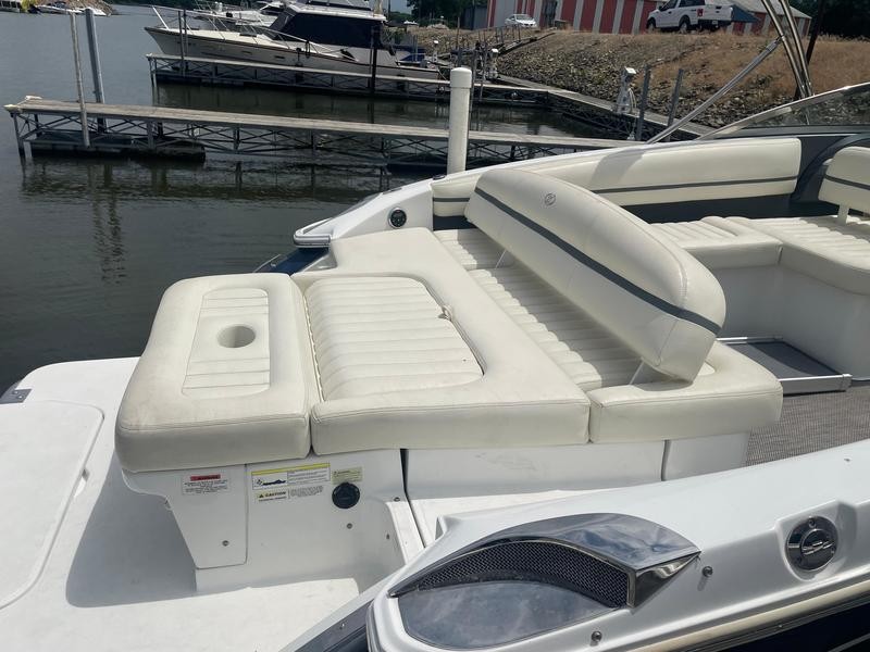 Cobalt re-engineered how it builds its boats’ hull and deck liners. It has instituted a process that it calls free space reclamation (FSR), and it results in an extra foot of interior width in the cockpit, giving the R7 the space of a beamier boat. Cobalt uses the space wisely. Check out the double-wide seat in front of the port console with an adjustable backrest that lets passengers face backward or forward. Score one for versatility. The rest of the cockpit seating is designed to create a conversation pit, from the L-lounge that extends along the transom to the love seat behind the helm. The transom bench backrest also adjusts so it can be used to kick back on the sun pad. A cushion in the sun pad flips up on starboard chocks to create a backrest for a rumble seat. All of the seating is covered with durable, weather-resistant Nautiflex vinyl.