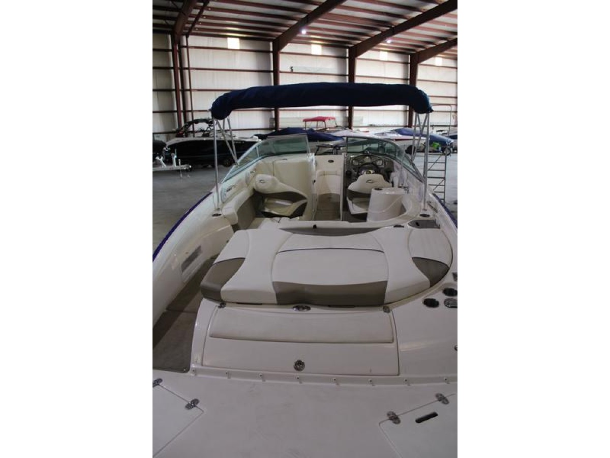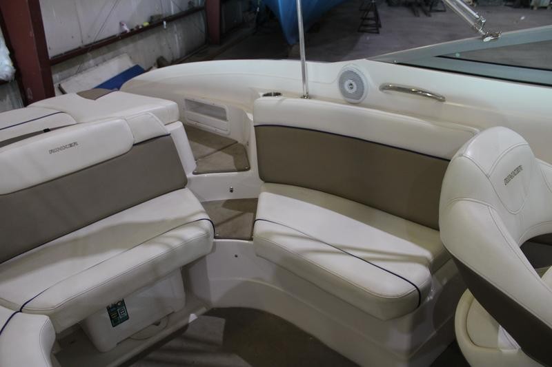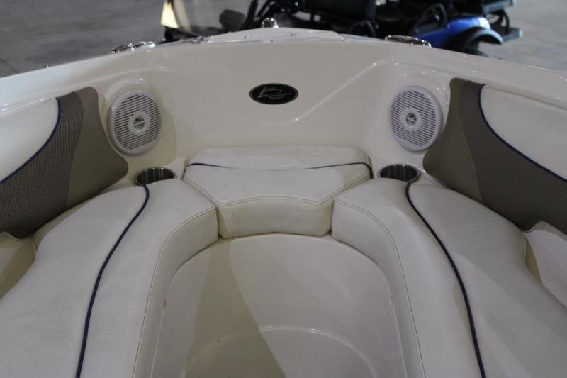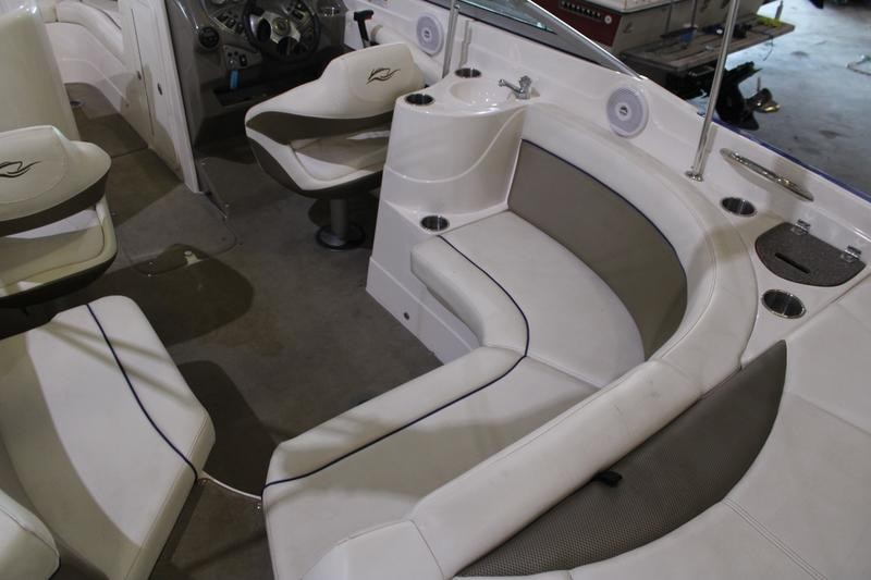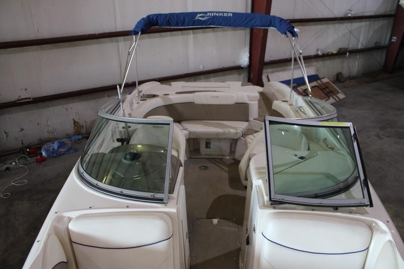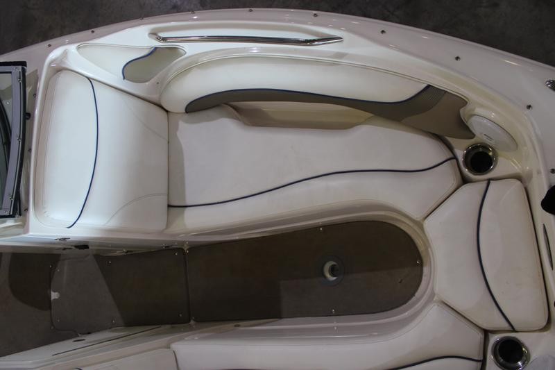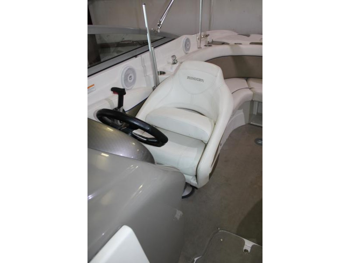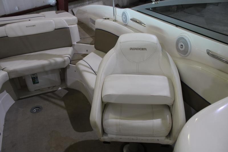 The aft cockpit seating configuration has a large U-shaped lounge with portside transom walk through. The miniature wet bar to starboard and removable snack table makes this a very comfortable entertainer. Sporty helm has the look of a European performance car with contoured tilt wheel. The array of gauges are arranged for easy reading along with accessory toggle switches. The Clarion AM/FM CD stereo remote is also within quick reach. On the companion side Rinker installed a spacious compartment for changing into swim wear or for a portable head (included). A convenient ski locker is situated between the 2 swivel bucket seats at the helm that feature tri-tech suspension with flip up bolsters and thick padding. Astern there is a large sun lounge with a multi position pad that covers the engine bay. Additionally there is a transom shower and plenty of cup holders. At the bow there is enough seating for 4 people to enjoy the snack table. Under the forward cushion is a deep anchor locker for the fluke style anchor and a boarding ladder for easy beach access. This is truly a great boat for spending the day on the water with the family and friends.