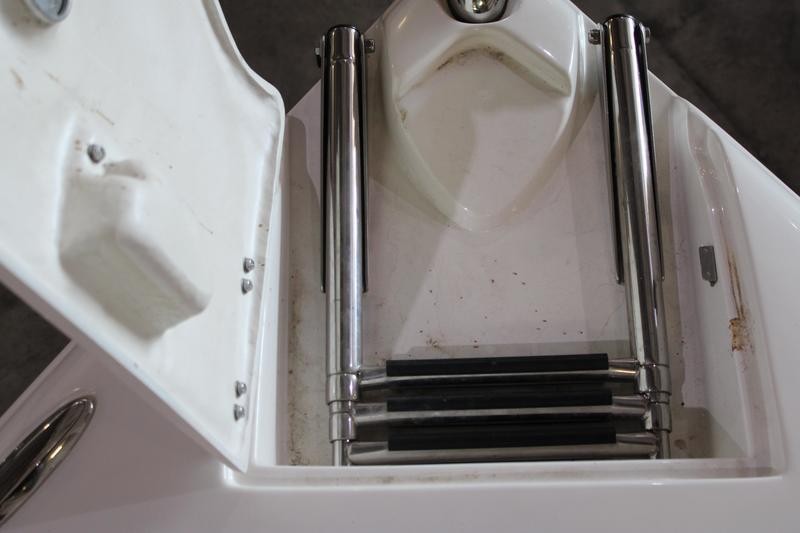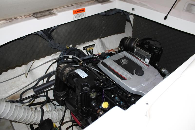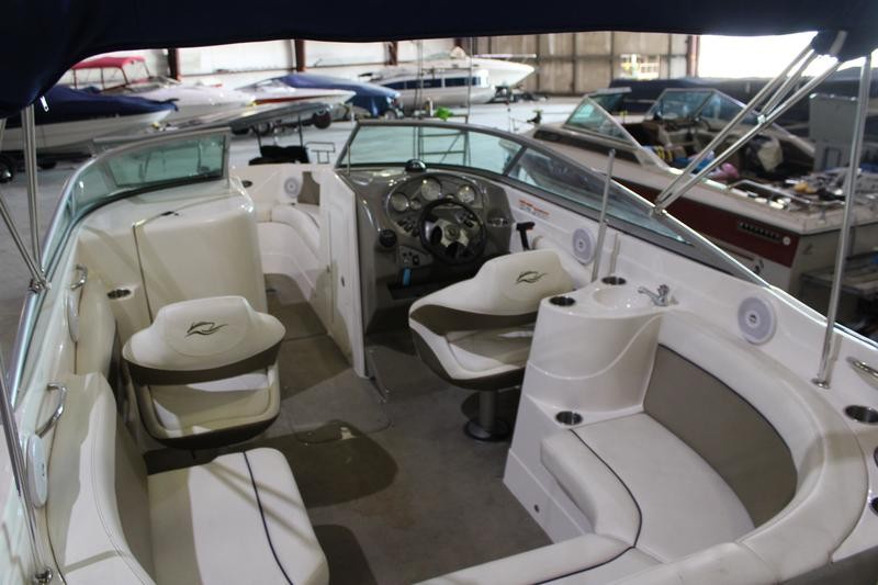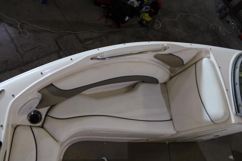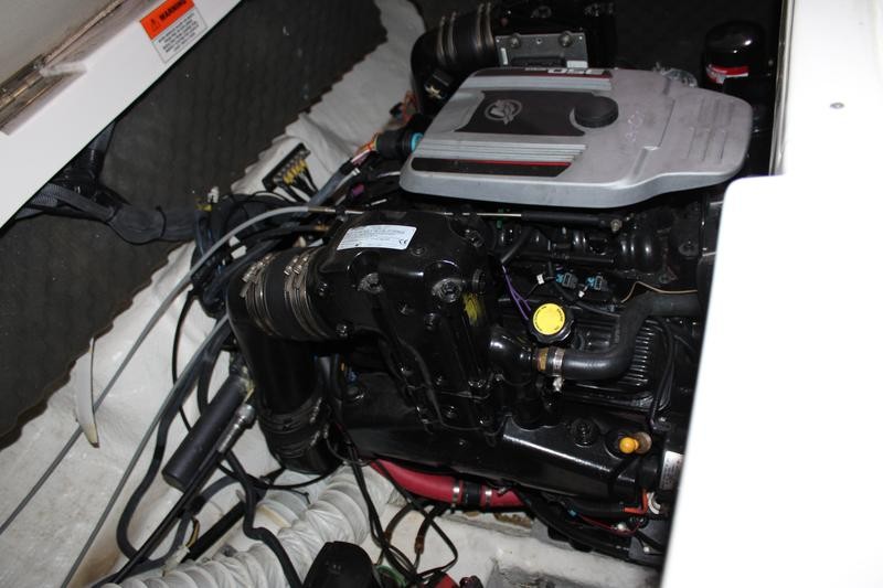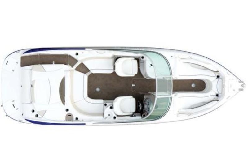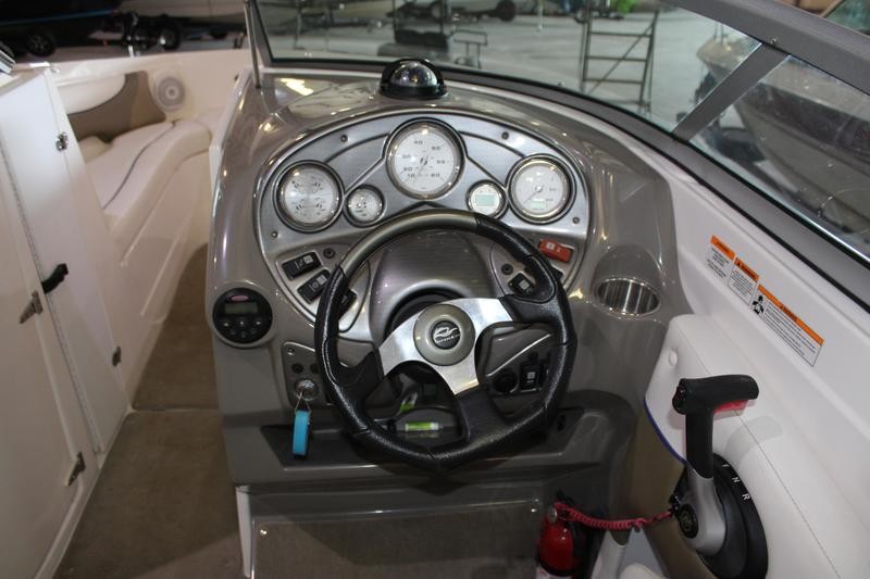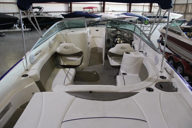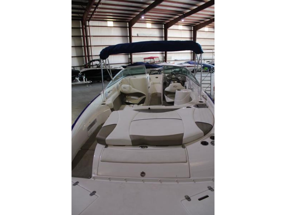 The aft cockpit seating configuration has a large U-shaped lounge with portside transom walk through. The miniature wet bar to starboard and removable snack table makes this a very comfortable entertainer. Sporty helm has the look of a European performance car with contoured tilt wheel. The array of gauges are arranged for easy reading along with accessory toggle switches. The Clarion AM/FM CD stereo remote is also within quick reach. On the companion side Rinker installed a spacious compartment for changing into swim wear or for a portable head (included). A convenient ski locker is situated between the 2 swivel bucket seats at the helm that feature tri-tech suspension with flip up bolsters and thick padding. Astern there is a large sun lounge with a multi position pad that covers the engine bay. Additionally there is a transom shower and plenty of cup holders. At the bow there is enough seating for 4 people to enjoy the snack table. Under the forward cushion is a deep anchor locker for the fluke style anchor and a boarding ladder for easy beach access. This is truly a great boat for spending the day on the water with the family and friends.