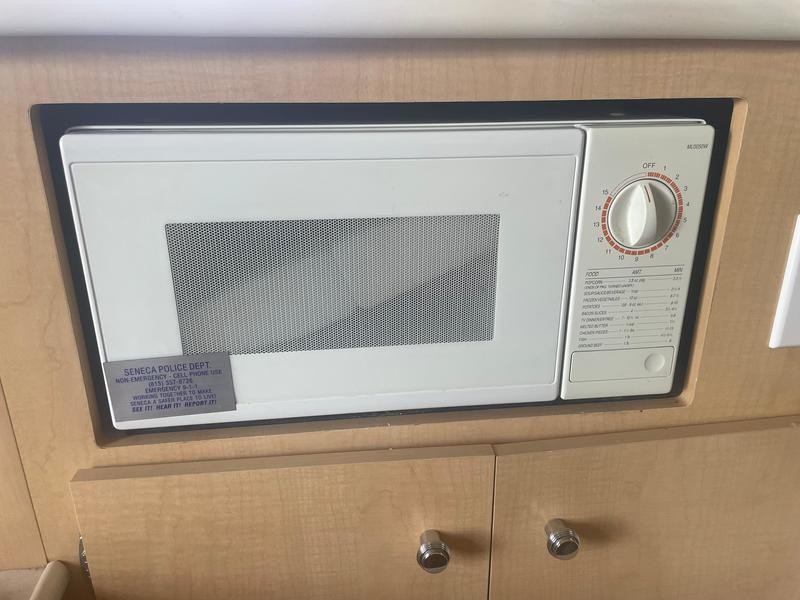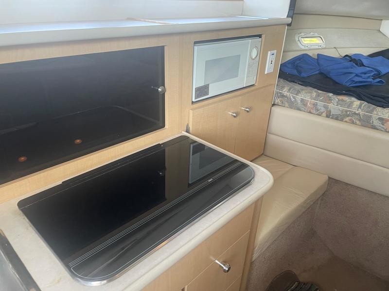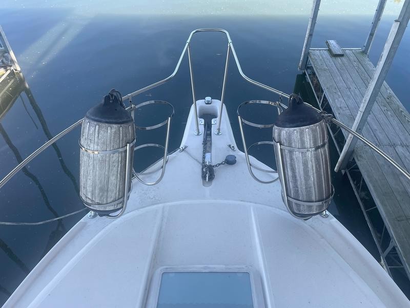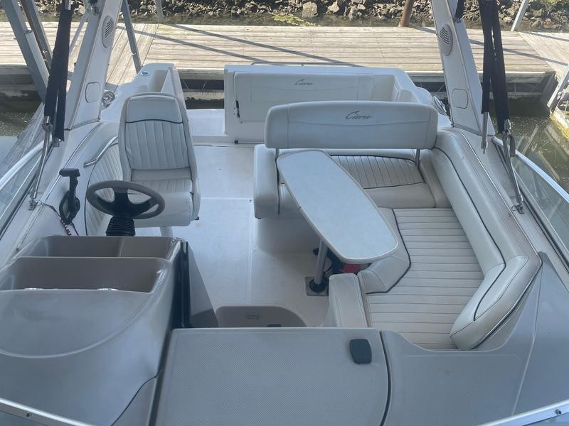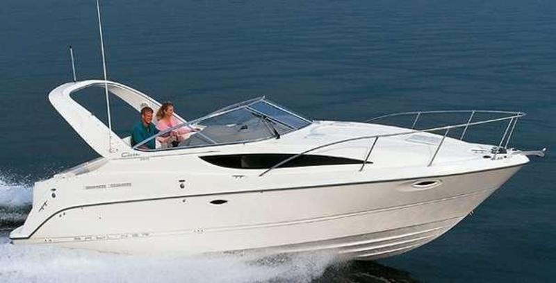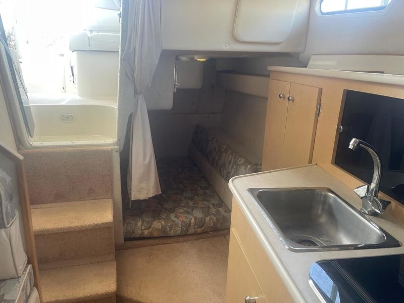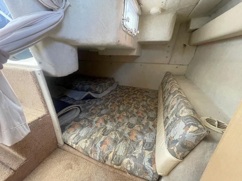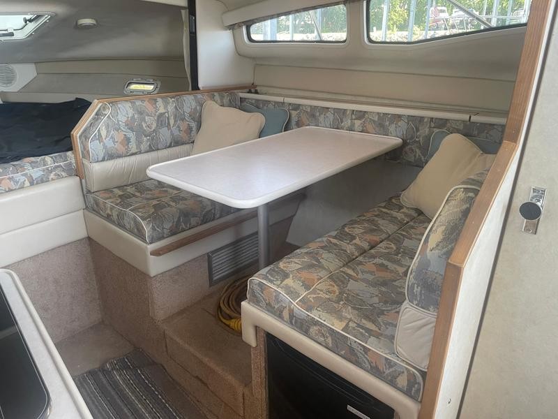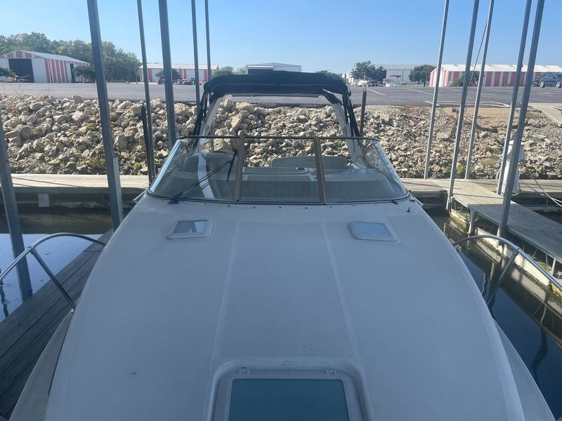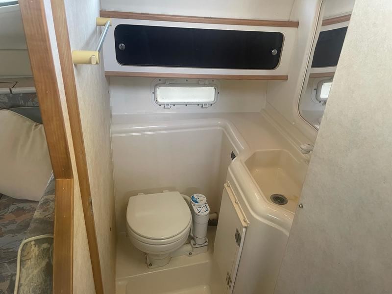Built on a solid fiberglass hull with a relatively wide beam the mid-cabin floor plan of the 2855 features a v-berth with a privacy curtain and a mid-cabin to comfortably sleep four. The option to sleep two more is available with the convertible dinette just across from the galley. A wet head features and electric flush toilet. The cockpit offers seating for 6 with a dedicated captains chair and flip our rear bench seat. The center line walk through windshield offers easy access to the bow.