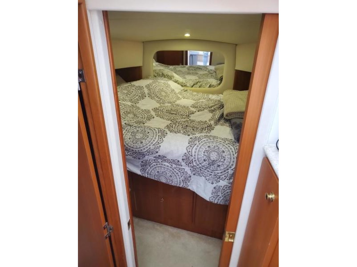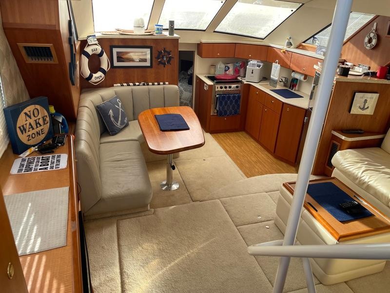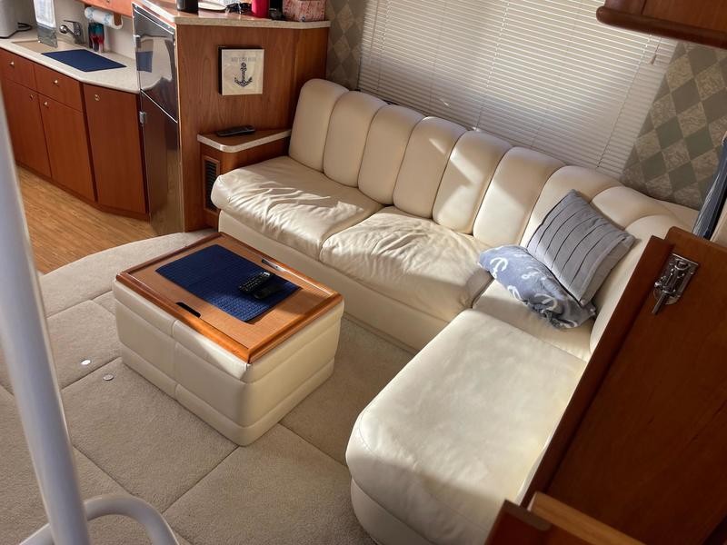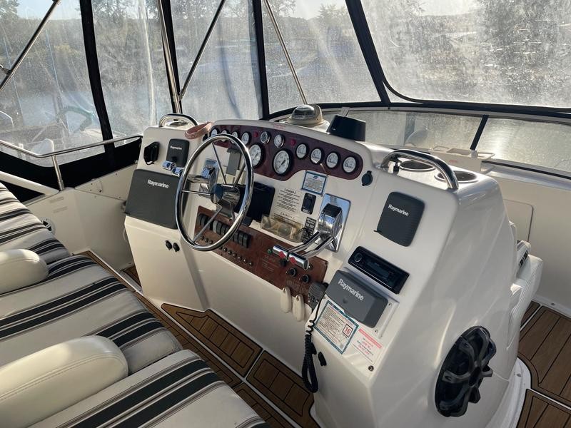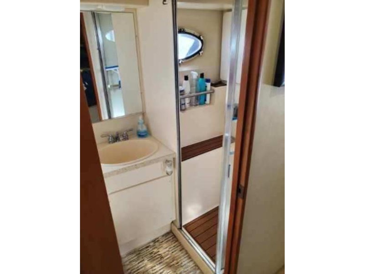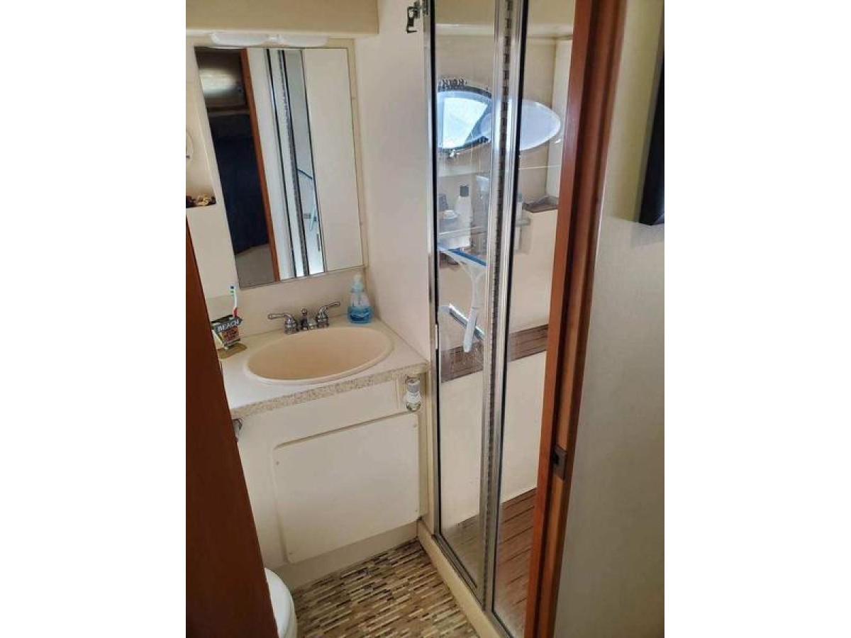 When looking for an affordable max volume cruising yacht you will find much to like in the 392 Motor Yacht. Silvertons grand design eliminating the side decks and instead opting for elevated "sidewalks" as Silverton called them, Silvertons designers were able to produce a massive interior utilizing the full 14ft 1in beam for the salon. The interior features cherry cabinetry, large Ultra Leather sofas and dinette with a full-service galley. Both staterooms have access to separate heads with full standing showers. Topside the Helm has well labeled easy to understand controls with a bench seat forward and aft of the helm counsel. The afterbeck features a hardtop, wet bar and large bench seating. Built on a solid fiberglass hull the 392 Silverton is said to cruiser around 15-16 knots and reach a top speed just over 20 knots.
