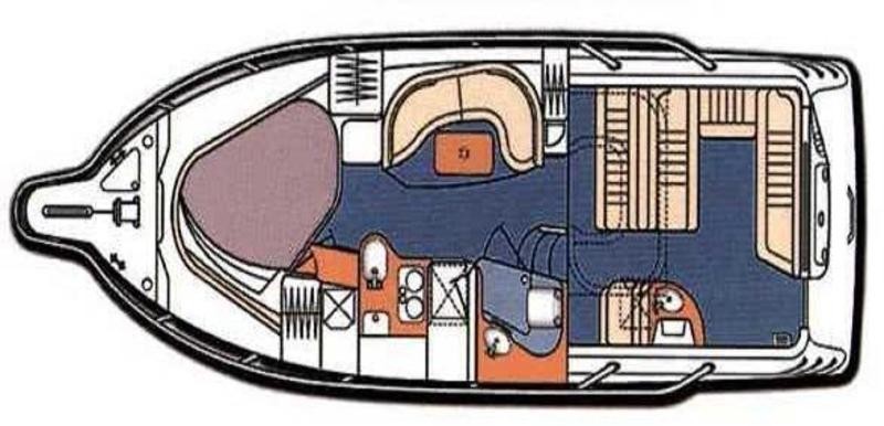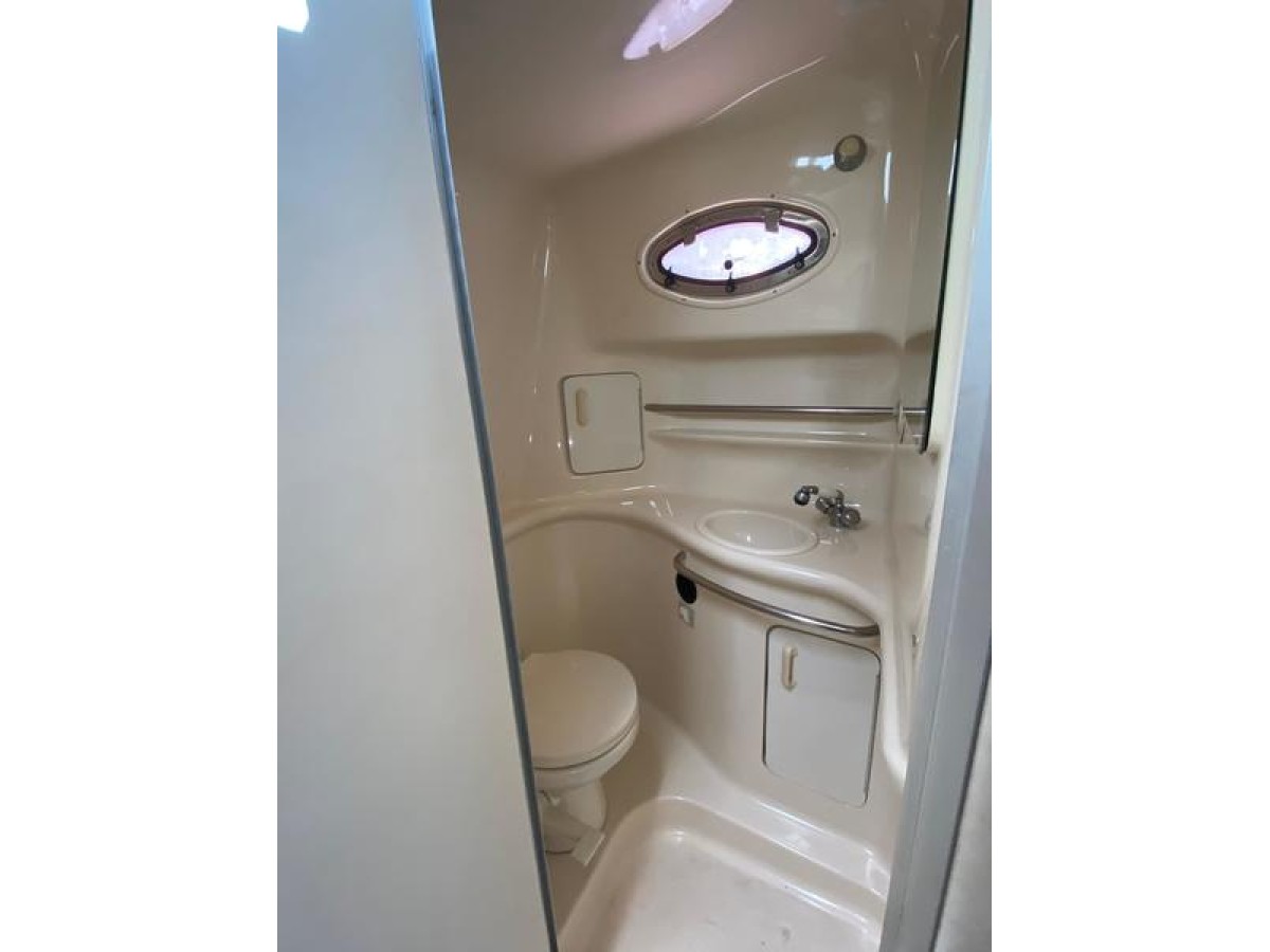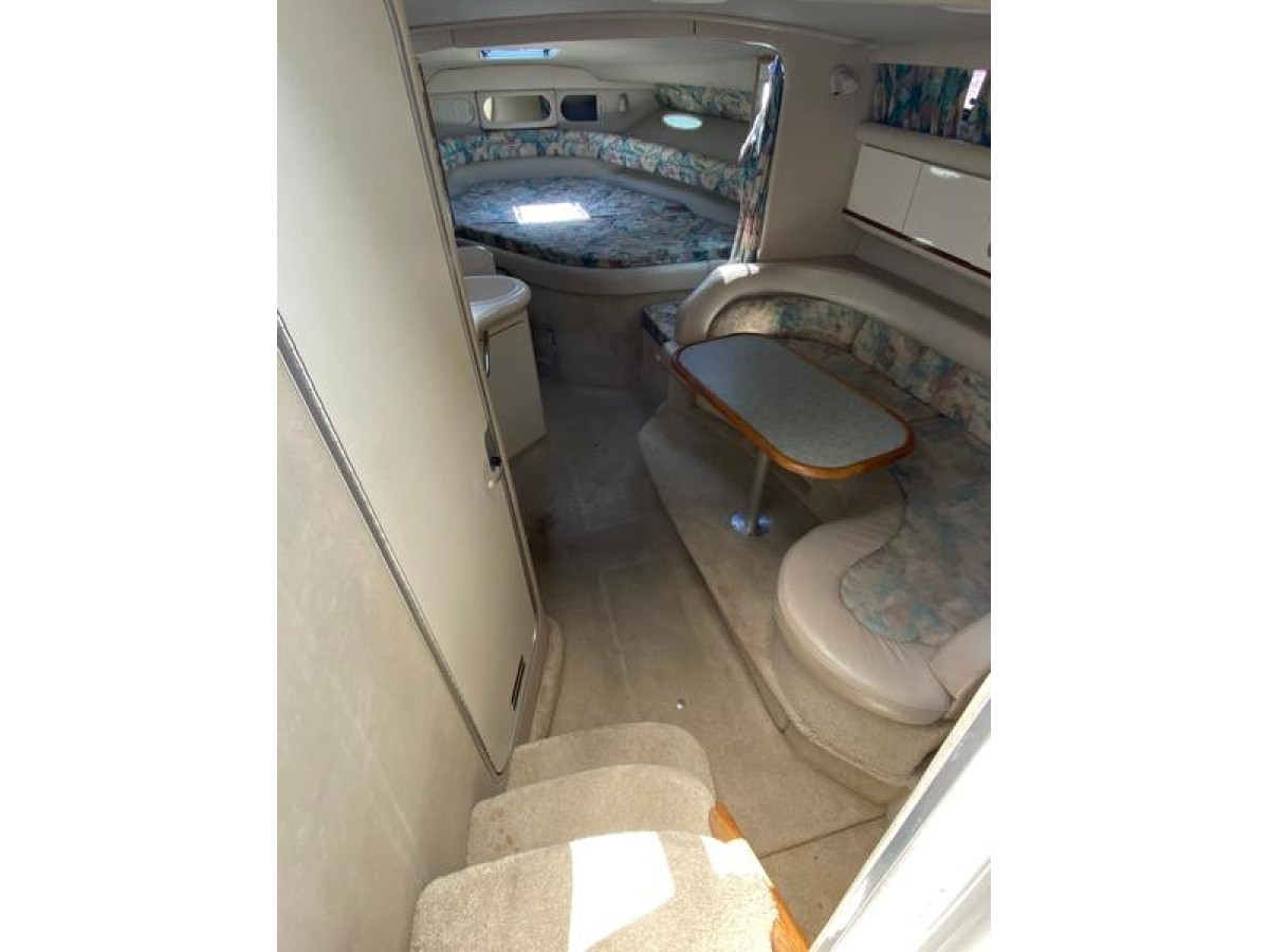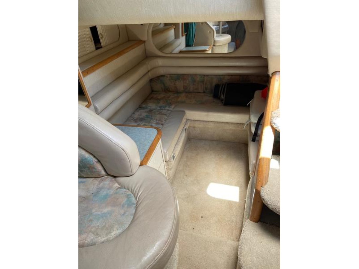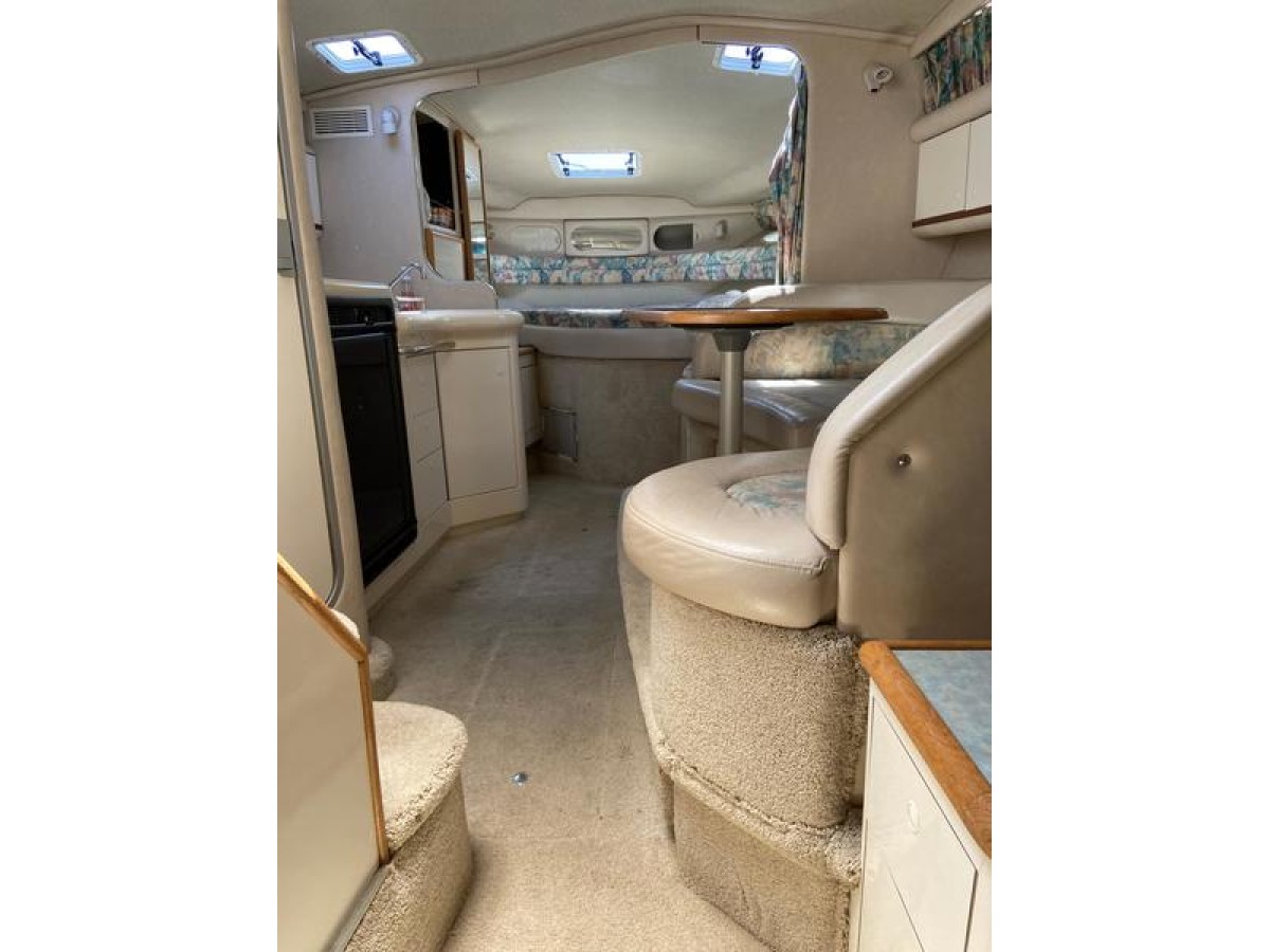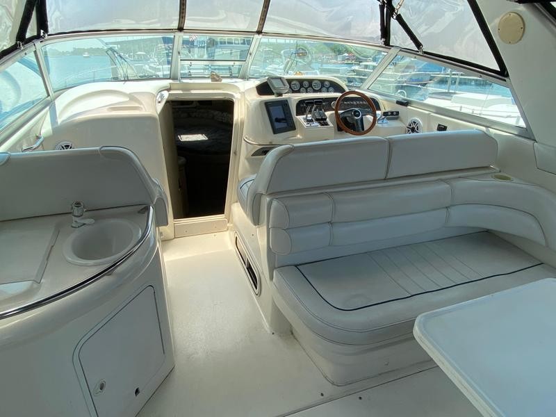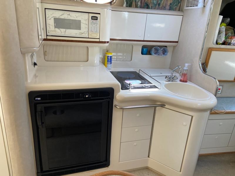 The Sea Ray 330 Sundancer stands apart from the crowd. A large, versatile cockpit and all the performance anyone ever needs in a family cruiser. The double helm seat gives captain and navigator a clear view of the water through the tempered glass windshield, which is center-vented to catch sea breezes and provide access to the bow. All instrumentation is within easy reach. A port side wet bar stands ready to accommodate any cockpit refreshment needs. The convenient fold-down step assists passengers in boarding. The aft seat is hinged so that the cockpit sole rises for instant access to the engines. Below decks to starboard, a plush sofa provides plenty of room to relax as well as a comfortable dining area. The mid-stateroom functions as a conversation area during waking hours, then converts to a double berth during sleeping hours. A screened sliding window admits plenty of fresh air and light. The forward stateroom features a double berth, two large mirrored hanging lockers and a privacy curtain that encloses the entire area. The head is located just inside the cabin door, The compartment includes a Vacu Flush toilet, vanity with sink, and shower with curtain. In the galley, appointments include a large sink, refrigerator, flush-mounted two-burner electric stove, and microwave.