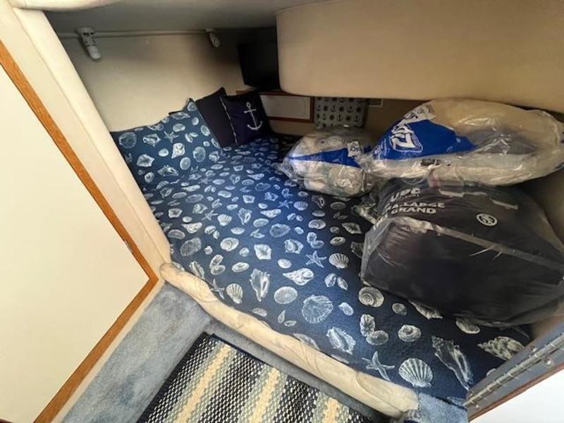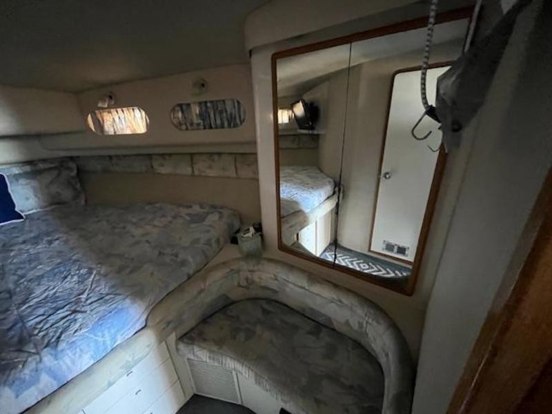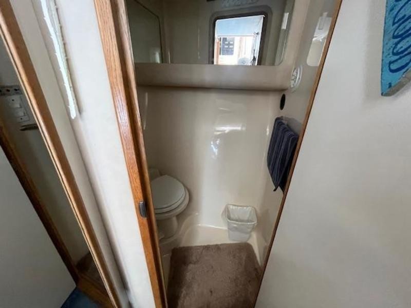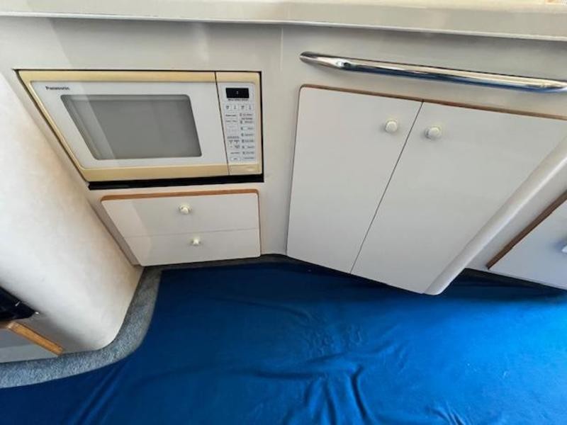 The full width interior salon allows the creation of a wide open expanse for entertaining inside in air conditioned or heated comfort. There are 2 staterooms to accommodate 4 adults in comfort, each having it's own head and TV. The large salon area also has a dinette and table that can also lower to make a huge third sleeping area! Included in this area are a custom molded counter top, breakfast bar with built in blender, concealed glass and bottle storage, microwave, stove, coffee maker and can opener. Upper and lower cabinets allow for ample storage.