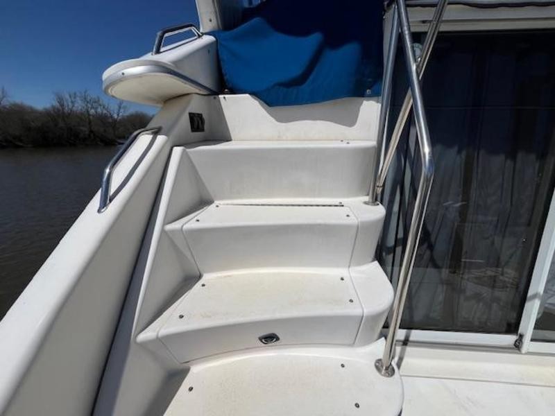 On the fly bridge you will be pleasantly surprised to find a vast area for relaxation, entertaining as well as the helm control station. This area easily allows 8 adults to spread out and enjoy the view. A center walk through allows easy and safe access to the forward deck for docking or to enjoy the twin sun pads!