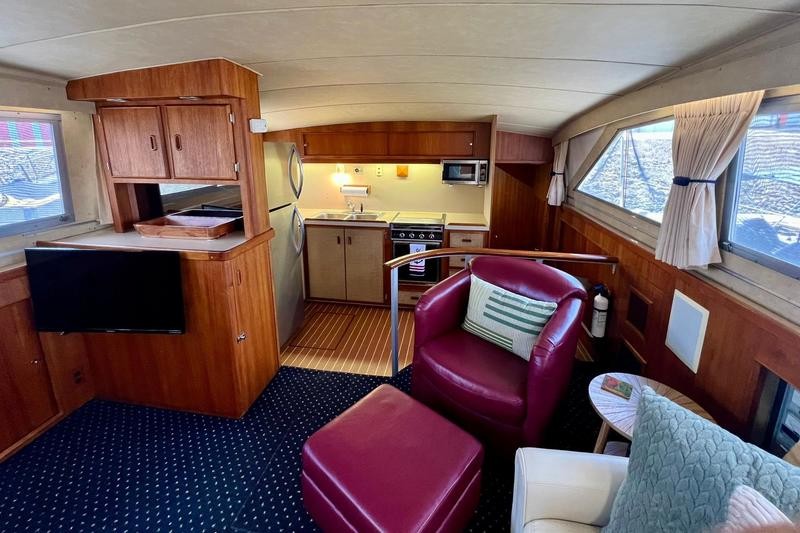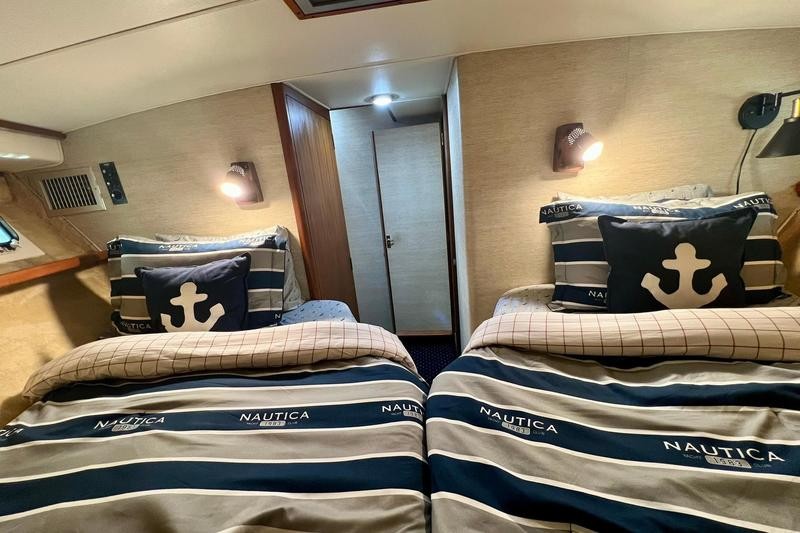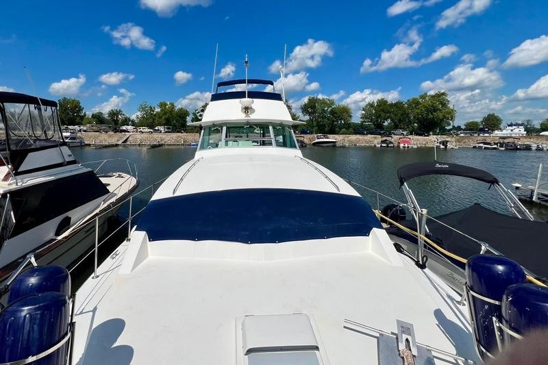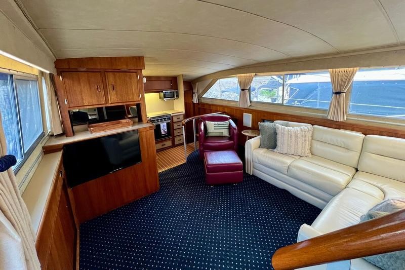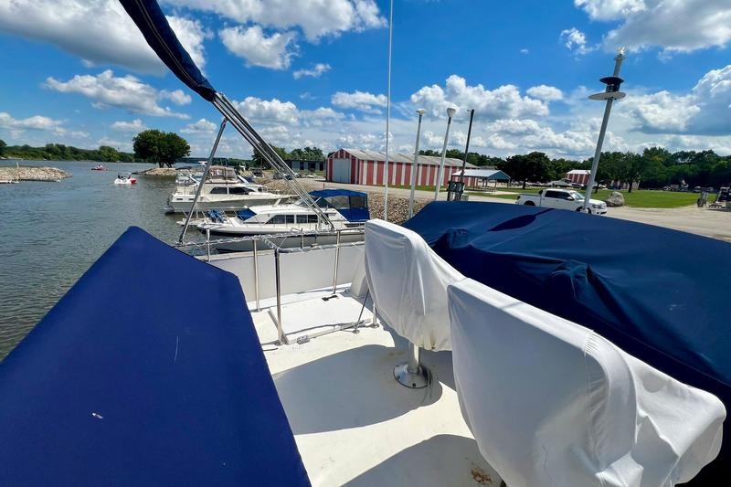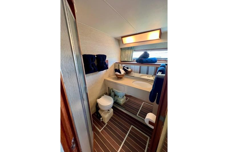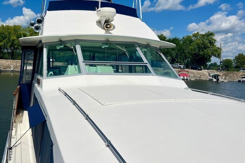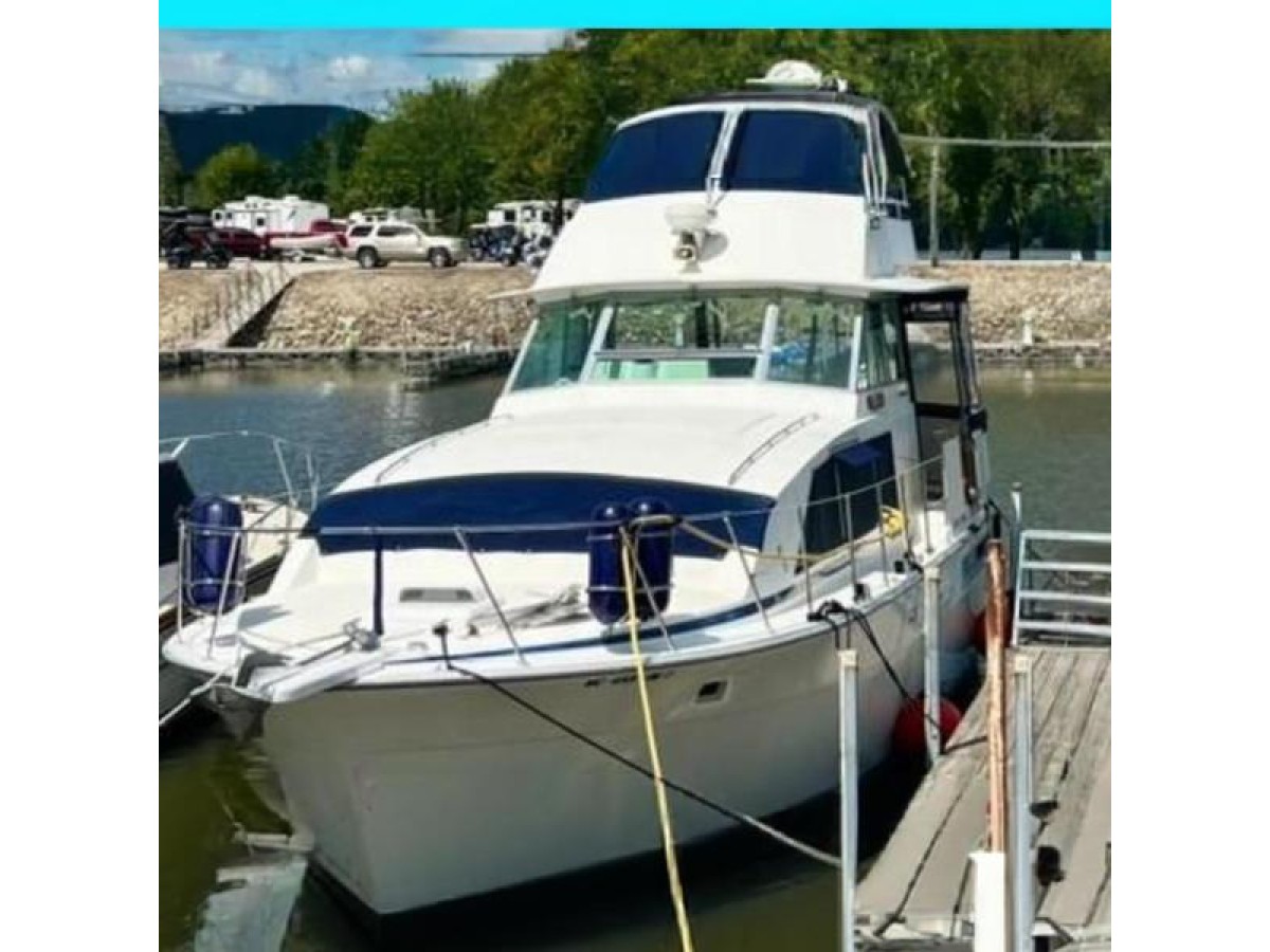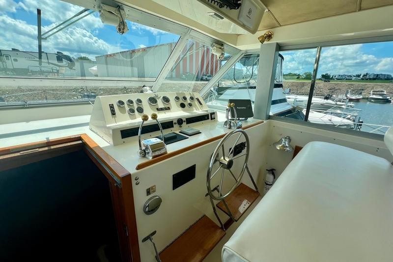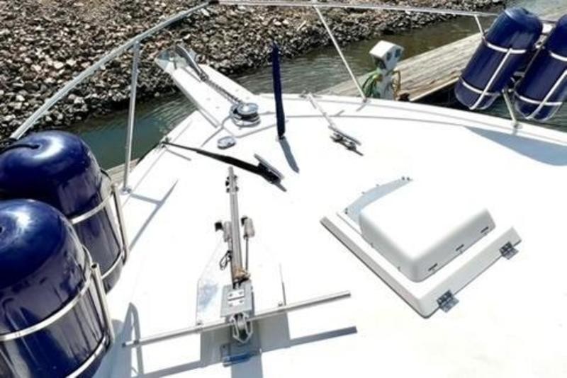 “Gadabout? is a classic Bertram 42 Motor Yacht. She has enjoyed her lifetime in freshwater. There is a huge v-berth forward followed by a large hanging locker to starboard. There is a central vacuum in this locker. To port is a sizable head with plenty of storage. 90 degree stairs up to the galley provide plenty of privacy for this forward cabin. She has a large mid-level galley with full size residential refrigerator, electric range, microwave, double sink and tons of storage. Aft of the galley is a beautiful salon with a custom leather sectional that can be converted into a bed that sleeps two. It also has latched drawers underneath for more storage. The salon has a mounted 120/12V television with built in dvd player. Aft is a spacious stateroom with 2 full size beds. There are 2 hanging lockers and storage everywhere. This aft stateroom contains a full size head with enclosed shower. This 1984 Bertram comes with a warm teak interior, not the Formica of older models. Gadabout sleeps 8 comfortably.