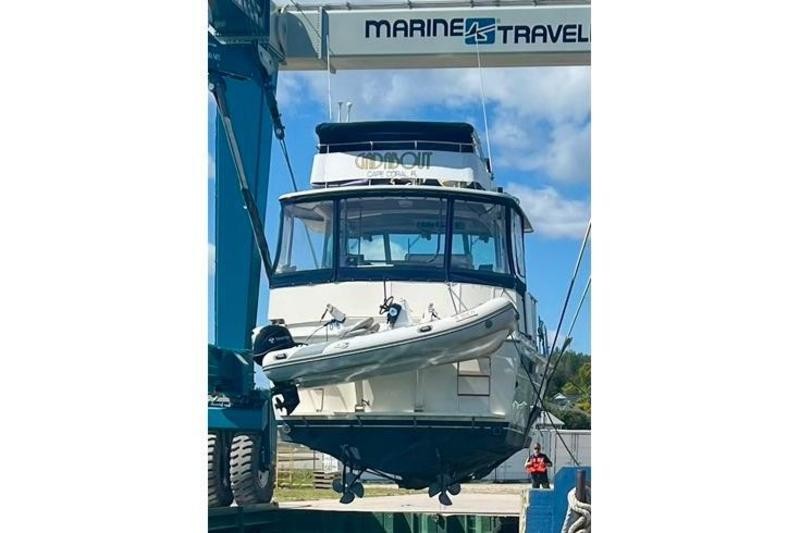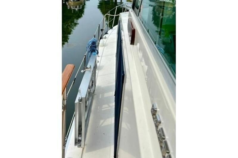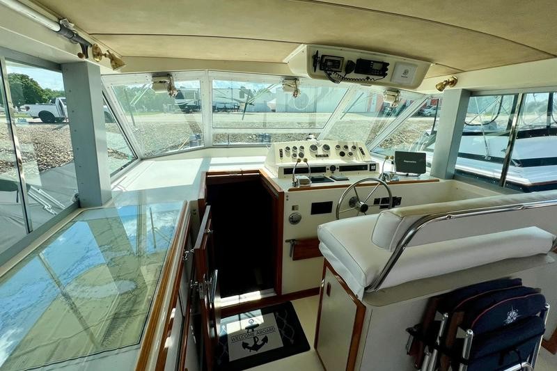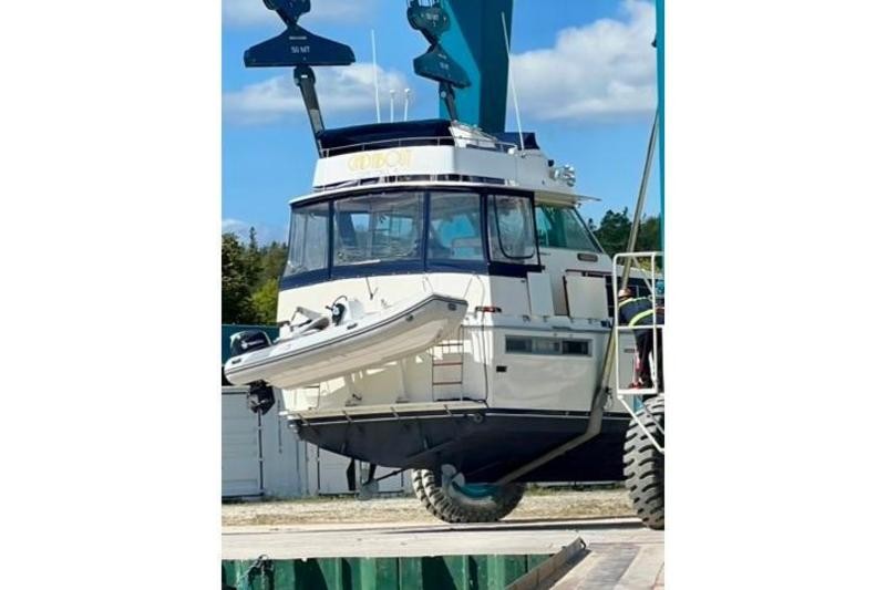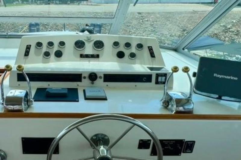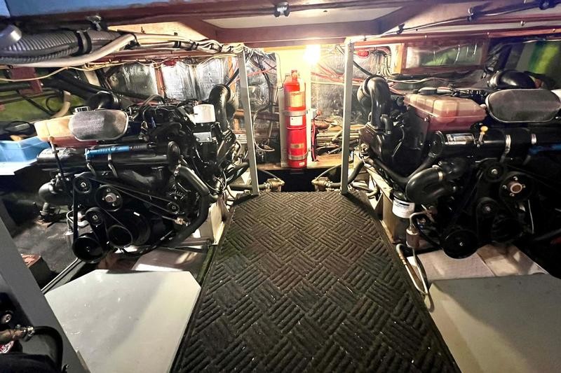 Repowered with twin Mercruiser 8.1s in 2006, the old fiberglass fuel tanks were removed and aluminum tanks installed. There are davits on the stern with over 1000 pound capacity. With only 850 hours she is ready to take you for an adventure of a lifetime. Flush deck motor yachts like the Bertram 42—with the lower helm forward on the semi-enclosed aft deck—are seldom seen these days, but back in the 1970s this was the way most motor yachts were designed. With her proven deep-V hull, the Bertram 42 can handle sea conditions that keep other motor yachts her size in port. At planing speeds a Bertram 42 shoulders aside building seas. They are a remarkable combination of build quality and design.