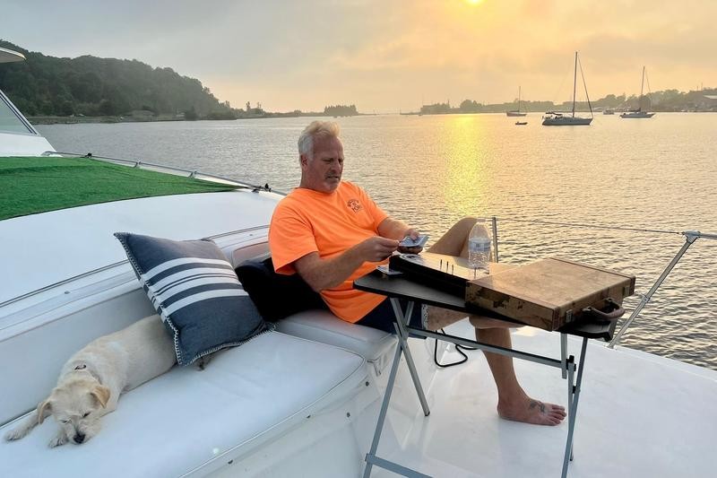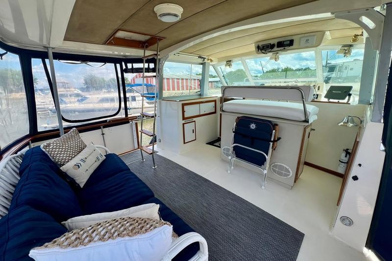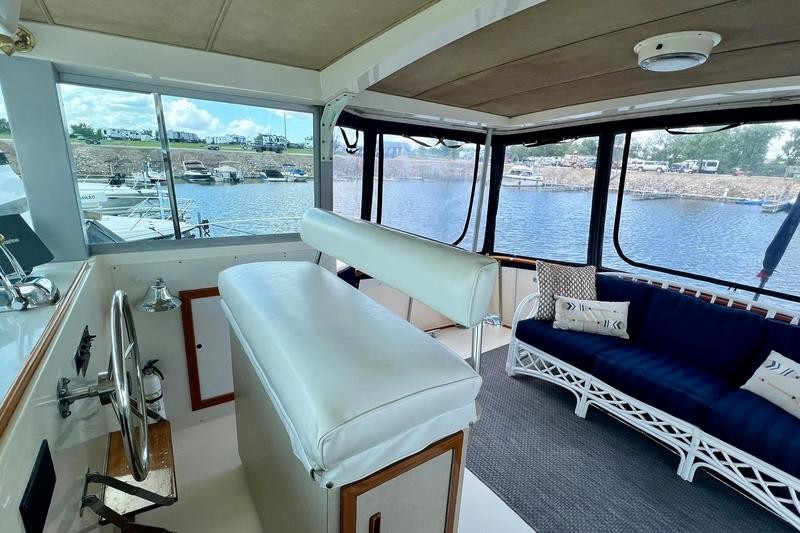 The “old school? fly bridge has two captain’s chairs and an 8 foot upholstered bench seat. The owner has had 5 adults on this bench for fireworks