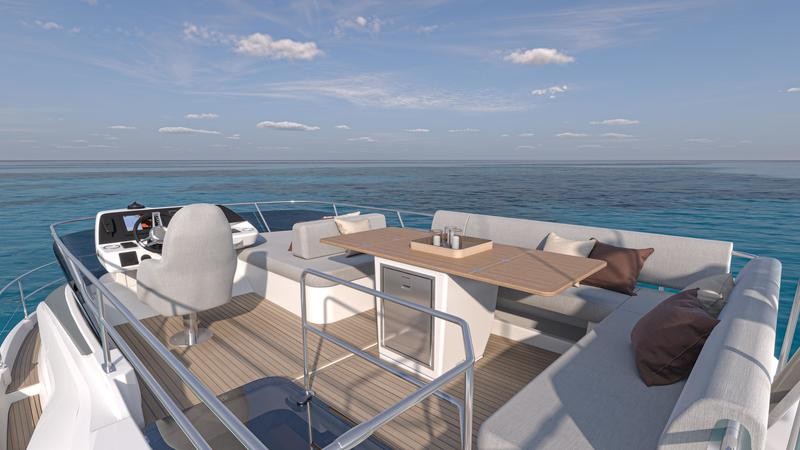 For sharing special moments and entertaining, the cockpit saloon features comfortable C-shaped bench seating with an ocean view that everyone can enjoy. Just steps away, a hydraulic swim platform facilitates diving, chatting with feet in the water, or simply relaxing, listening to the lapping of the waves... For those who wish to extend these exhilarating moments at the water's edge, an optional exterior galley can be installed, with a sink and a grill.