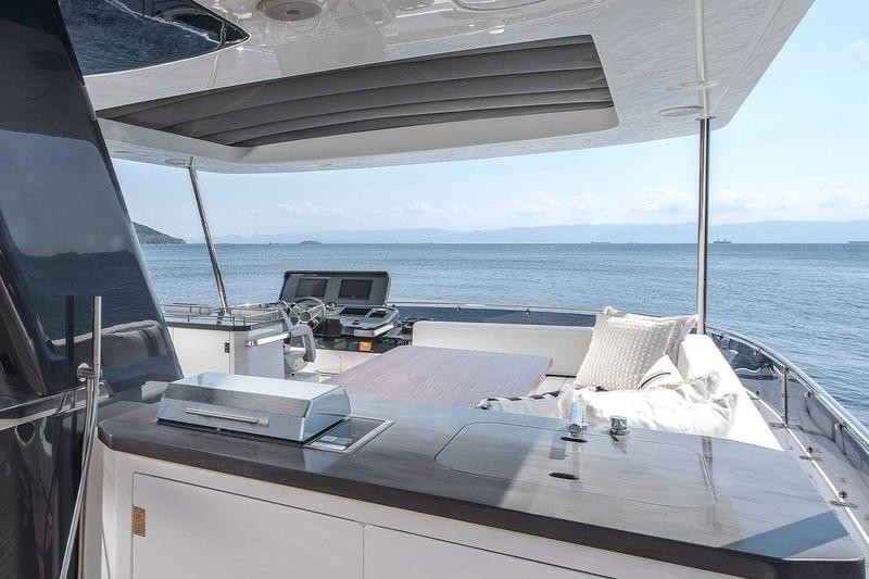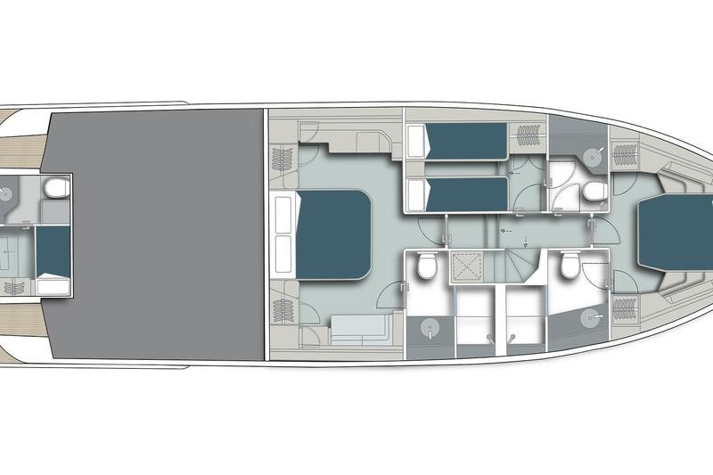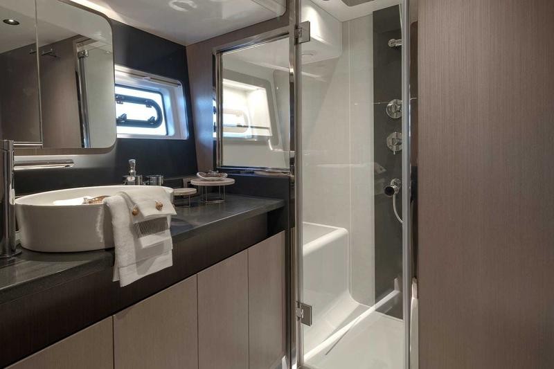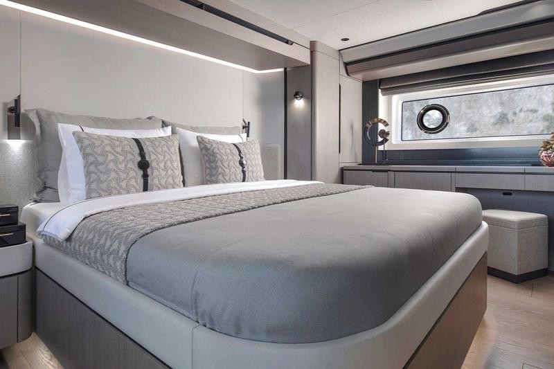 Below deck, the full-beam master suite serves as a peaceful retreat with soft tones, generous storage, and a private en suite. The VIP and guest cabins are equally comfortable, offering elegant accommodations for family or friends. An optional crew cabin adds flexibility for extended cruising.