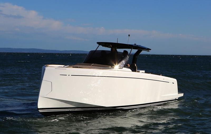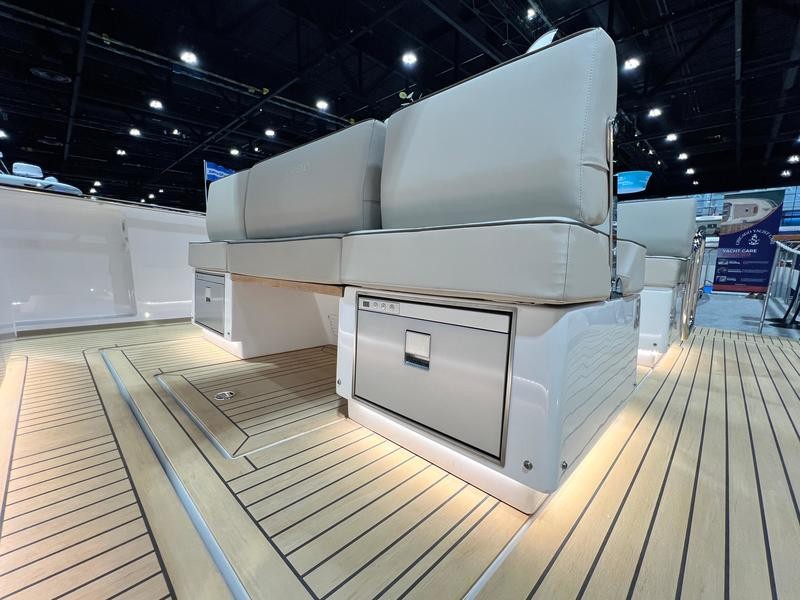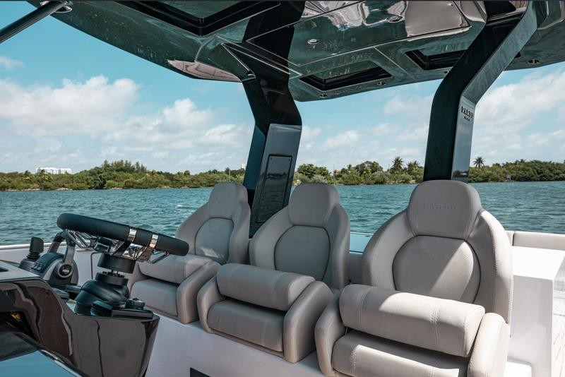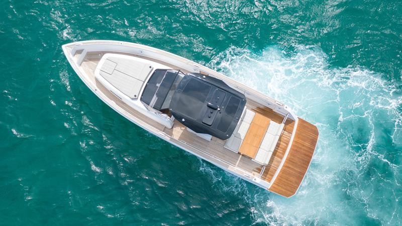 The walk-around deck plan ensures safety, easy movement and well-being on board. The T-Top is built with carbon technology covering the wheelhouse area with an optional electrical Bimini that can cover the dining/lounging area at stern.