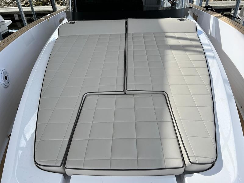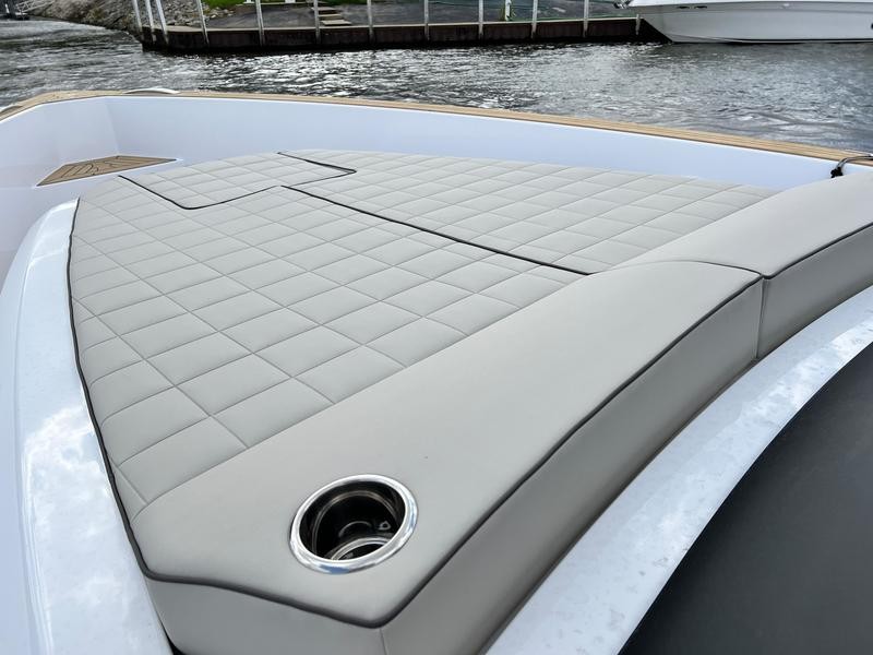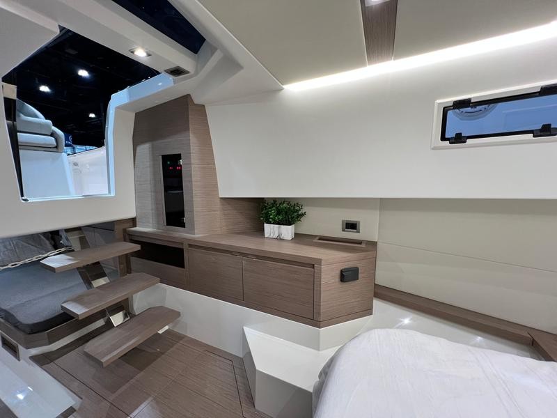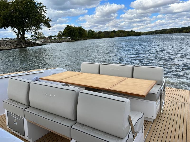 The lounging areas are located both at the bow with a large and comfortable sunbathing area for three people, and at the stern with two settees and a foldable table allowing the space for six. The linearity and refinement of the furnishings are enhanced by the careful choice of the woods and the attention to details that make the interiors of the Pardo 38 true excellence.