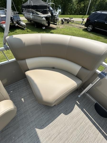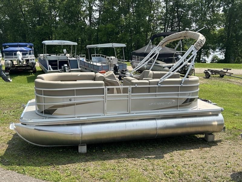 Sun, fun, and affordability all come together on the Starcraft LX 18 R pontoon boat. This feature-packed vessel is perfect for creating lasting memories on the water with family and friends. The included Bimini top provides shade for everyone on board, ensuring a comfortable cruise no matter the time of day. The captain stays in control with a comfortable low-back bucket helm seat, while the rest of the crew can relax and enjoy the scenery from the plush lounge seating that surrounds the entire perimeter of the boat. This versatile seating arrangement allows everyone to find their perfect spot to soak up the sun, chat with companions, or simply enjoy the ride. Re-entering the boat after a refreshing swim is a breeze thanks to the convenient rear entry ladder. With its focus on relaxation, comfort, and affordability, the Starcraft LX 18 R pontoon boat is the ideal choice for a fun-filled day on the water.