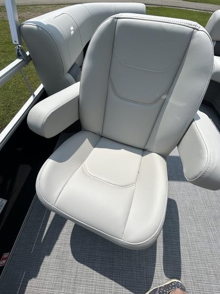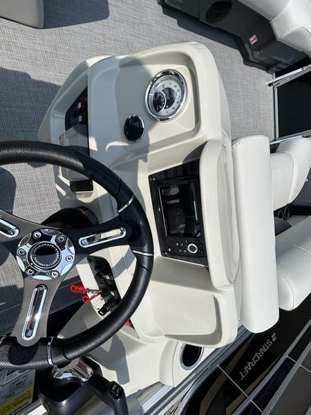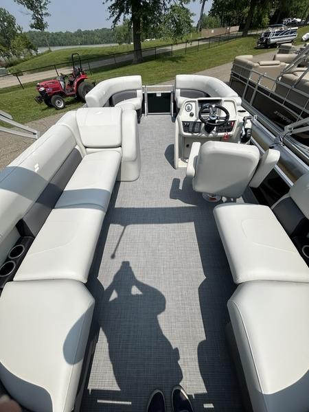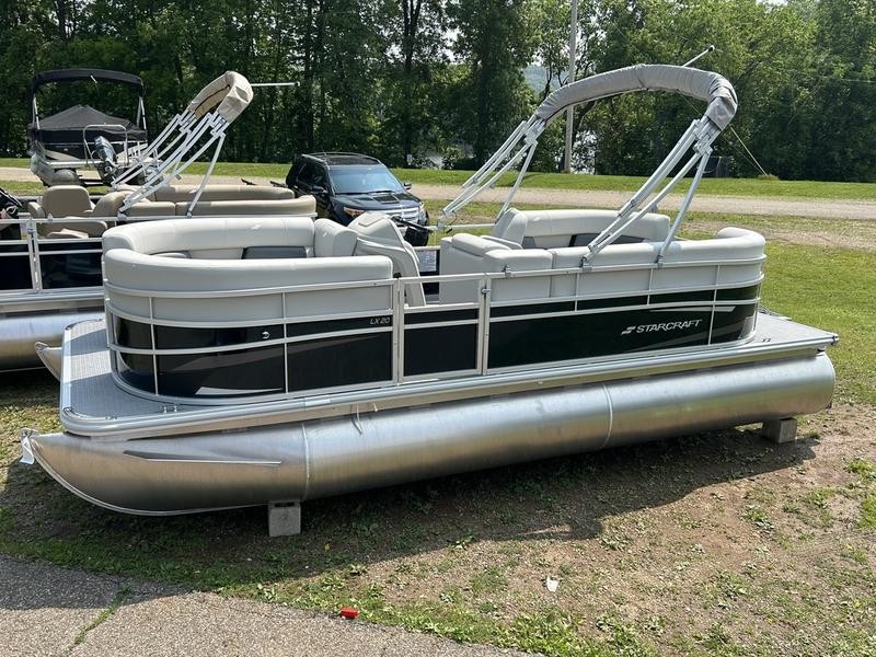 Sun, fun, and affordability all come together on the Starcraft LX 20 R pontoon boat. This feature-packed vessel is perfect for creating lasting memories on the water with family and friends. The included Bimini top provides shade for everyone on board, ensuring a comfortable cruise no matter the time of day. The captain stays in control with a comfortable low-back bucket helm seat, while the rest of the crew can relax and enjoy the scenery from the plush lounge seating that surrounds the entire perimeter of the boat. This versatile seating arrangement allows everyone to find their perfect spot to soak up the sun, chat with companions, or simply enjoy the ride. Re-entering the boat after a refreshing swim is a breeze thanks to the convenient rear entry ladder. With its focus on relaxation, comfort, and affordability, the Starcraft LX 20 R pontoon boat is the ideal choice for a fun-filled day on the water.