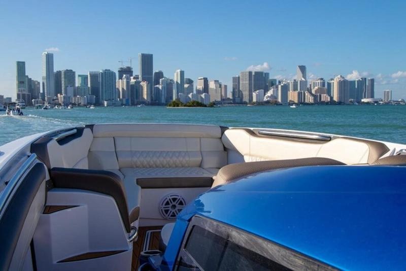 The vessel features large navigation displays, a premium marine audio system from JL Audio or Garmin, and underwater lighting that highlights the nightscape. Work directly with Nor‑Tech’s partners—such as Lumishore—for custom finishes that reflect your unique style.